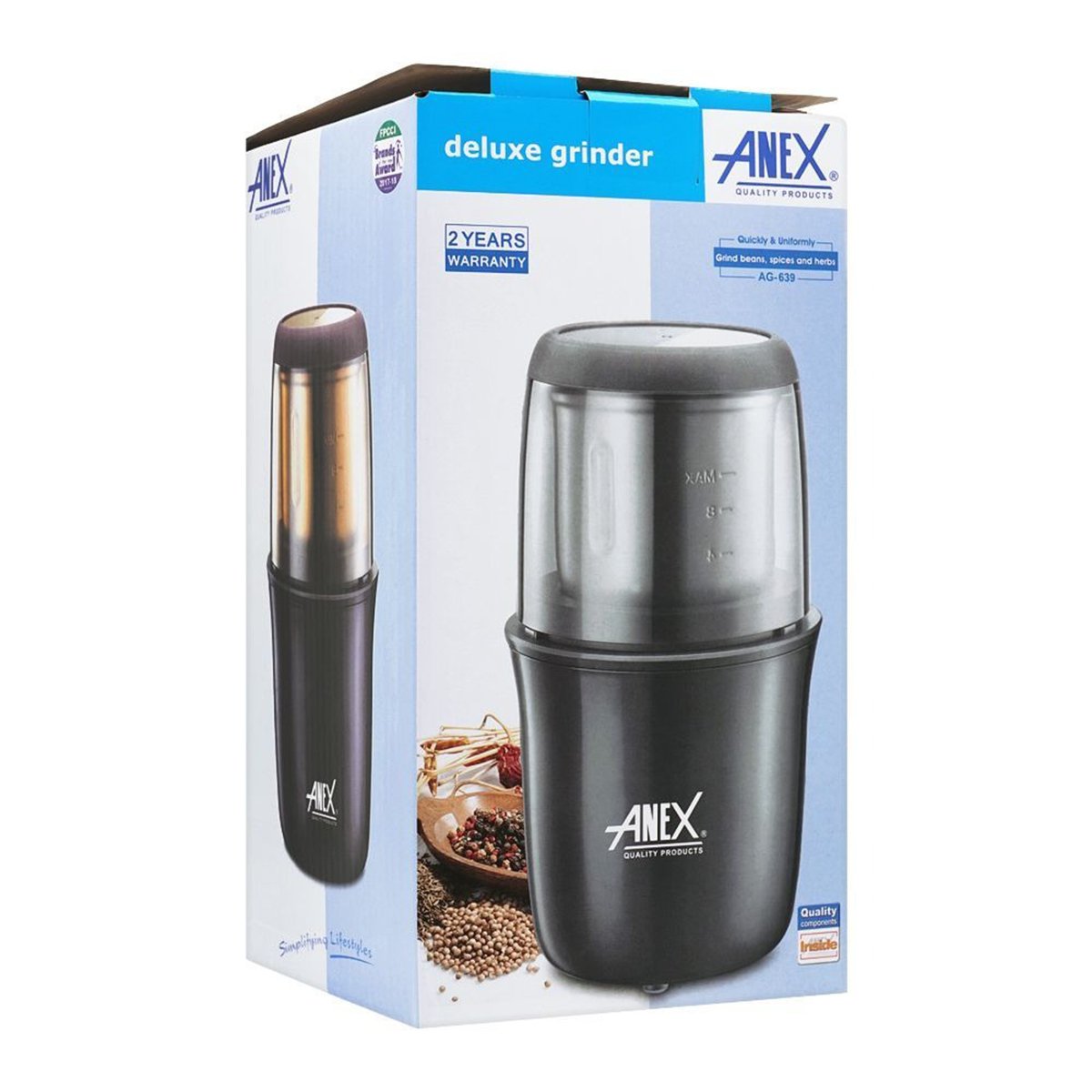 Discounts available on App Brand Warranty Pulse on/off switch Transparent Cover Easy clean removable bowl Stainless steel blade Powerful 200W motor Grinder capacity 75 grams WHAT S IN THE BOX 1 x AG-639 Deluxe Grinder1 x Warranty Card