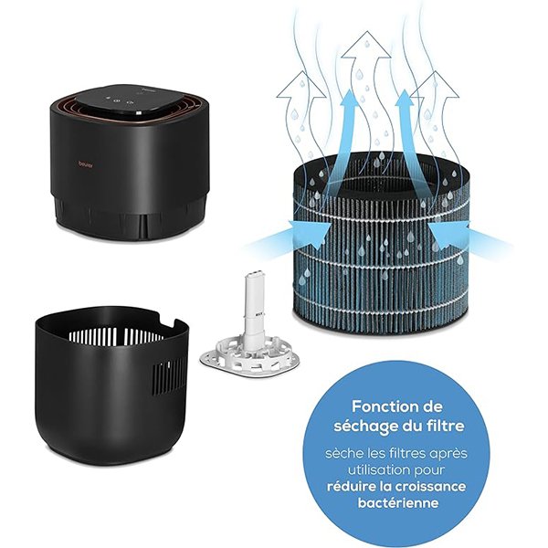 Air Humidifier with Energy Efficiency and Cold Evaporation Technology ENERGY SAVING TECHNOLOGY: The humidifier uses efficient cold evaporation technology to allow natural air humidification while saving energy HYGIENIC DISPLAY: 3 different ventilation speeds allow you to humidify the air in rooms up to approximately 45 m thanks to the intelligent automatic function, the humidification power adapts to the ambient air NIGHT MODE: the humidifier has a night mode with quiet operation and a control panel off in addition, the humidifier can be controlled by a timer FILTER DRYING FUNCTION: For even more hygienic humidification, the filter drying technology allows the filter to be dried after use to reduce the formation of bacteria EASY TO USE: The humidifier has a colorful humidity indicator for quick interpretation of air quality and a replaceable filter that includes a filter change indicator