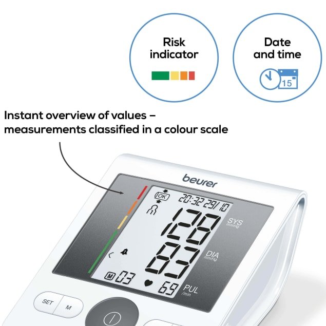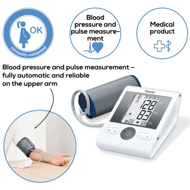 Upper Arm Blood Pressure Monitor The blood pressure monitor has a universal cuff that is also suitable for larger upper arm circumferences up to 42 cm. The patented resting indicator shows you whether haemodynamic stability is achieved during the measurement and the measured values are therefore comparable. The integrated cuff position control gives you additional certainty about the accuracy of the measured blood pressure values during each measurement. Furthermore, the measurement accuracy of the BM28 during pregnancy has been verified by a clinical validation study. Patented resting indicator Universal cuff, including for larger upper arm circumferences up to 42 cm Fully automatic blood pressure and pulse measurement on the upper arm Average of all saved measured values Cuff position control 2 adjustable alarm times Easy-to-read display 4 x 30 memory spaces Risk indicator Suitable for prenatal care Arrhythmia detection Medical device For upper arm circumferences from 22 to 42 cm Date and time/automatic switch-off Incorrect usage message Low battery indicator Storage bag