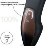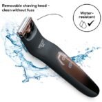 Flexible double-sided stainless steel shaving blade for maximum comfort Length-adjustable rotating attachment with 13 different trim lengths for the body and face LED display for battery display, travel lock display, charge display as well as maintenance indicator