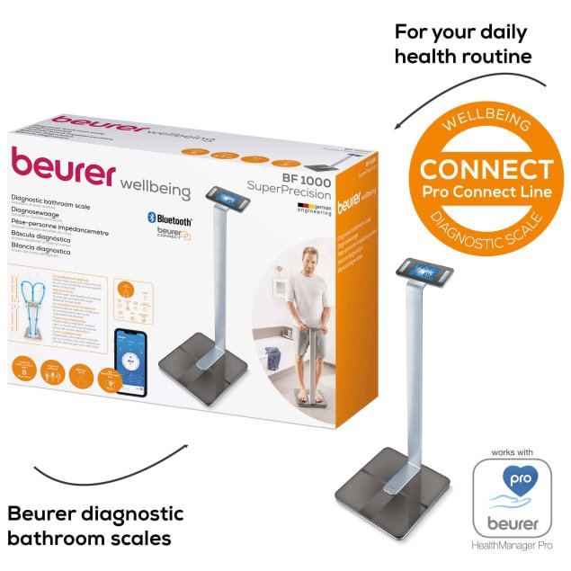 Diagnostic Bathroom Scale The new BF 1000 Super Precision provides you with everything that you want, and even a bit more. With a total of 8 electrodes for the hands and feet and the special cross measurement, in additional to your weight, it also shows body fat, visceral fat and body water, muscle percentage, bone mass and calorie requirements. Detailed full-body analysis with app connection Including cross measurement with 8 electrodes for precise monitoring of different areas of the body For professional weighing raised display on an aluminium stand with blue lighting Weight, body fat, visceral fat, body water, muscle percentage, bone mass, AMR/BMR Body fat and muscle percentage in segments Illuminated XXL display: 112 x 65 mm State-of-the-art dot matrix display Intuitive user menu in: D, GB, F, ES, I ITO2)surface finish on the scale Brushed stainless steel electrodes (hand-held unit) Standing surface: 10 mm thick safety glass 5 activity levels User memory spaces: 10 + guest mode Measurement memory spaces: 30 Switch-on technology: Button-on and quick start Automatic switch-off, overload indicator Weight capacity: 200 kg