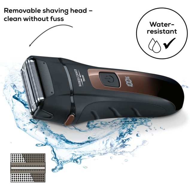 Beard trimmer with shaving foil & extendable detail trimmer The foil shaver fits optimally against the contours of the face and allows for a thorough shave. The extendable detail trimmer allows for daily shaving and precision beard styling to be combined. The high-quality device has everything you need for comfortable beard shaving. High-quality triple-blade shaving system With extendable detail trimmer LED display with battery display, travel lock display, charge display as well as maintenance indicator Removable shaver head unit for hygienic cleaning under running water Device is water-resistant (IPX 6) Integrated quick-charge function Powerful lithium battery: 60 minutes shaving time; 90 minutes charging time Shaving possible with both battery and mains operation Incl. protective cap, cleaning brush and storage bag
