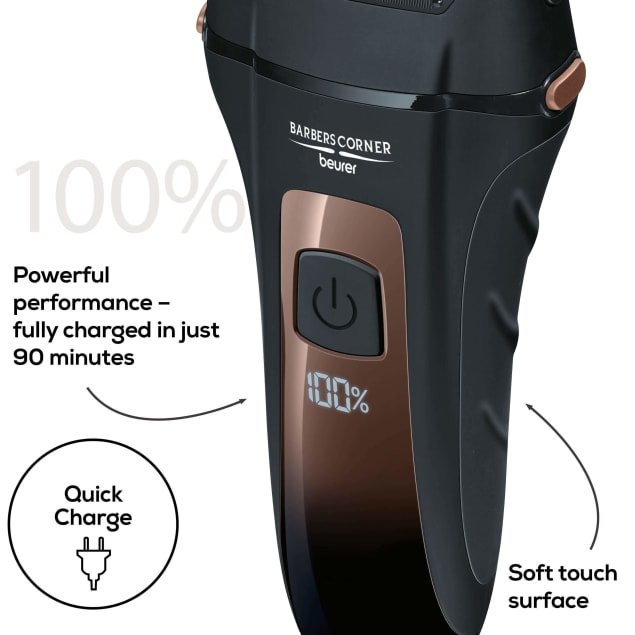 High-quality triple-blade shaving system With extendable detail trimmer LED display with battery display, travel lock display, charge display as well as maintenance indicator