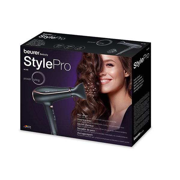 Beurer Hair Dryer Triple Ionic Function ion technology in 3 stages for individual styling and shiny hair Professional AC motor for high output and a long service life Protection function protects the hair and preserves its dazzling colour 2200 watt power 3 heat settings 2 blower settings Lockable cold air setting to give the hairstyle hold Automatic overheating protection Hanging loop for easy storage Removable safety filter for simple cleaning Slim professional nozzle Volume diffuser AC motor Soft-touch surface