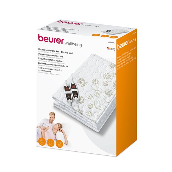 Heated underblanket for double bed Extra-large format: approx. 150 (L) x 160 (W) cm For 2 people 2 innovative LED button controllers for 2 individually adjustable heat zones 2 zones with 4 temperature settings each Breathable Beurer safety system (BSS) Automatic switch-off after approx. 12 hours Automatic switch-back from level 4/3 to level 2 after 3 hours Illuminated temperature settings Removable controllers Top side: soft fleece; underside: fleece Machine-washable at 30 C OEKO-TEX 100