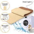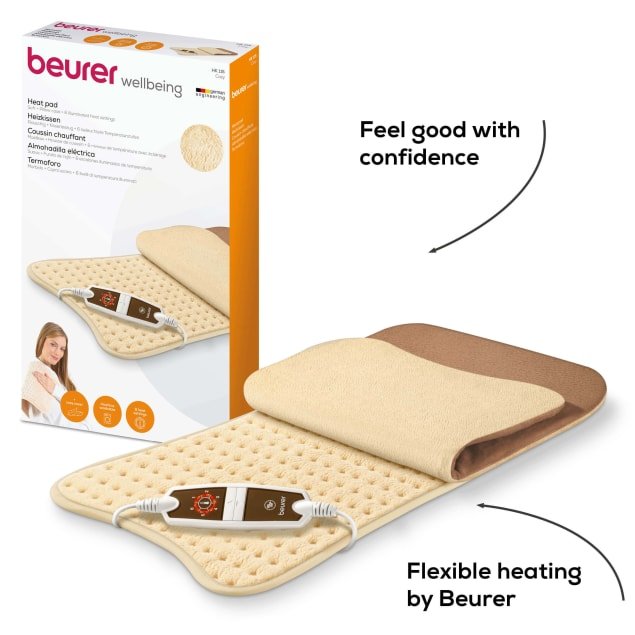 Fleecy XXL heat pad with removable cover & 6 heat settings Make yourself comfortable fleece fibres and the snuggly surface provide cosy warmth. Innovative LED button controller Butterfly shaped Extra-soft surface Breathable Snuggly and skin-friendly Fast heating 6 temperature settings Beurer safety system (BSS) Automatic switch-off after approx. 90 min. Accurate electronic temperature regulation Illuminated temperature settings Removable switch Fleece fibre heating pad Fleece fibre cover Heating pad/cover: machine-washable at 30 C