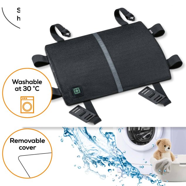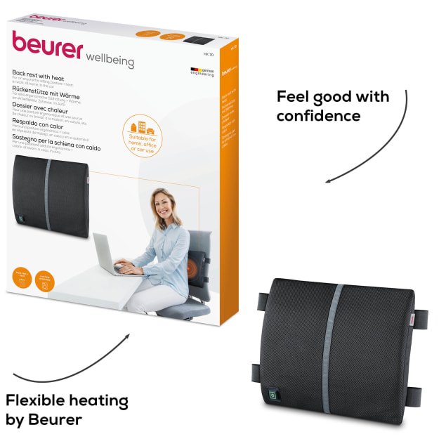 BEURER HK 70 HEAT PAD WITH BACK REST Pure bliss for your back health! The ergonomic back rest is your perfect companion for almost any kind of seat. Thanks to the universal attachment, you can quickly attach the device for an extra helping of heat on any chair back or the car seat. Suitable for universal use: ergonomic back rest with heat Universal attachment with 2 hook and loop fasteners at the side Simple operation with 1 button Incl. vehicle accessories Fast heating Temperature monitoring and safety switch-off Automatic switch-off after approx. 90 minutes Connection to the mains with handy spiral cable Cover with integrated heating pad: machine-washable at 30 C Inner pad (not washable)