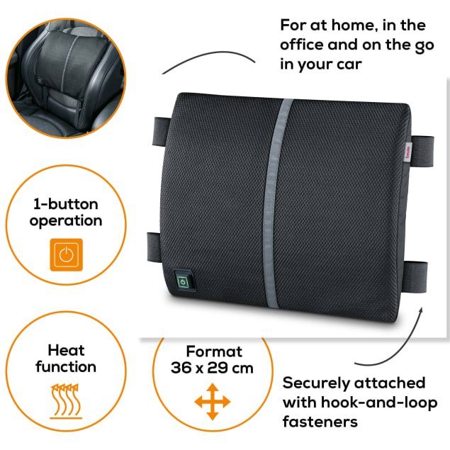 Suitable for universal use: ergonomic back rest with heat Universal attachment with 2 hook and loop fasteners at the side Simple operation with 1 button