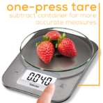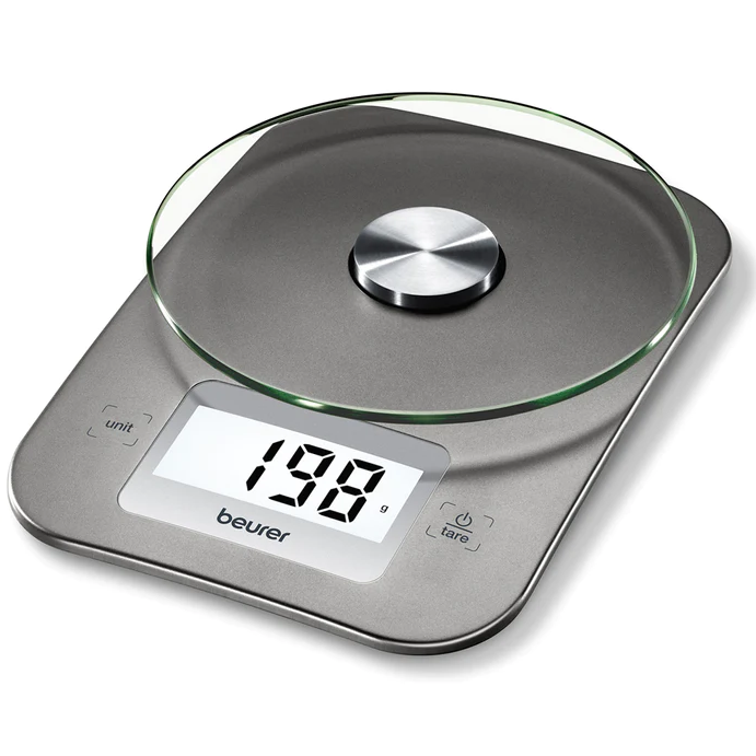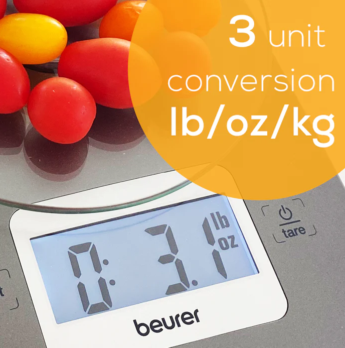 Multi-Function Digital Kitchen Scale LED DISPLAY The Beurer KS26 Food Scale is equipped with an LED display for easy-to-read and precise measuring THE ESSENTIALS:With an 11 lb. weight capacity, tare function, touch display, and auto shut-off after 2 minutes, this food scale is a must-have kitchen accessory. SLEEK DESIGN Our Glass Kitchen Scale has a sleek design that makes it perfect for cooking, baking, etc., and includes an easy-to-clean and resistant glass surface. SMALL & PORTABLE SCALE With its slim product dimensions of 7.9 x 5.7 x 1.4 inches the Beurer KS26 food scale is suitable for travel so you can keep track of your nutrition and measure exact portions wherever you go. Product Dimensions:7.9 x 5.7 x 1.4 in. 2 lbs.