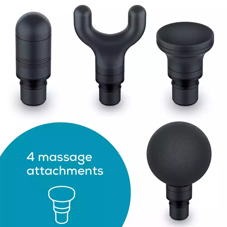Massage Gun Compact (Limited Edition) 5 intensity levels 4 massage attachments for individual use Powerful and soothing trigger point massage LED lights for displaying battery level and intensity level Lithium-ion battery for up to 5 hours of use Incl. case for practical storage