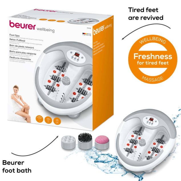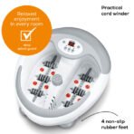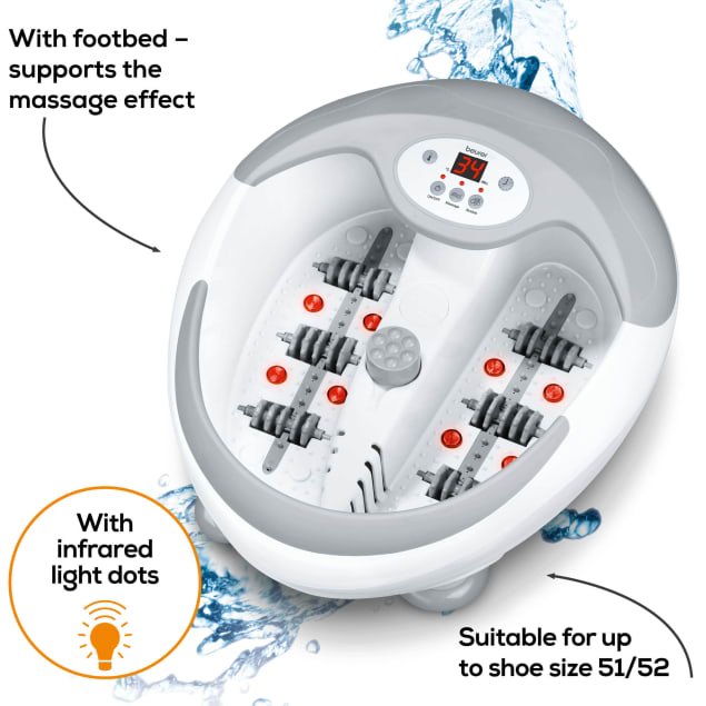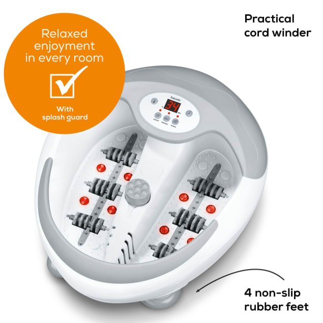 Beurer Relaxation Foot Spa Well-being really can be this simple. The foot bath with magnetic field and pedicure application and extra-powerful water heating ensures even stressed feet feel cared for and relaxed. Easy to use with LED display and timer function 3 functions: vibration massage, bubble massage, 5-level water heating (35 48 C) Soothing infrared light spots 6 integrated magnets for magnetic field application 3 interchangeable pedicure attachments, automatic rotation when pressure is applied to centre console Removable roller attachments for foot reflex zone massage Foot rest with massage naps Dry massage possible Splash protection Non-slip rubber feet Cord winder Dual-walled:for better heat insulation Suitable for up to shoe size 51/52