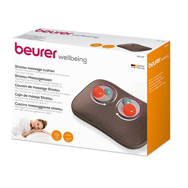 Shiatsu Massage Cushion RELAXING: Shiatsu massage with 4 3D massage heads rotating in pairs to simulate traditional shiatsu massage. INNOVATIVE DESIGN: The shiatsu massager cushion gives you the versatility of application and never looks out of place. REMOVABLE COVER: Suitable for machine washing for easy cleaning and hygiene maintenance. MULTI-FUNCTIONAL: The shiatsu massage cushion also offers an optional infrared light and heat function to bring a new dimension to your massage. EASY TO USE: The simple control allows you to start and end your massage, operate the heat function and choose the rotational direction. Includes: MG147 massage cushion, mains power cable, instructions for use