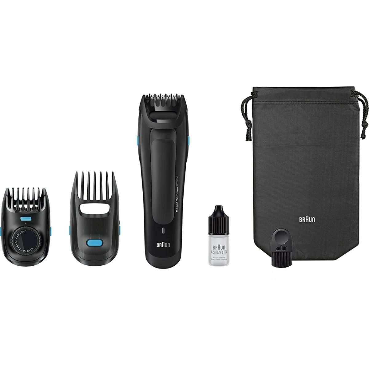 Braun beard trimmer 4x more precision for your style*. With precision dial for up to 25 exact length settings to create your style. Precision dial: Give your style the edge in exact 0,5mm steps Because 0,5mm can be the difference between exactly right and just ok, the precision comb gives you settings between 1 and 10mm in these fine steps. Simply set by turning the precision dial. Two detachable combs for the exact length settings you need Two integrated trimmers for great versatility: one for precision styling, one for efficient beard trimming. Braun precision combs Designed to be stronger than ordinary combs, they don t flex to enable you to get the precise look you want. Enjoy results that are even, exact, reliable and repeatable. Lifetime lasting sharp blades for precise trimming. The trimmer blades are engineered to stay sharp for their whole life. That makes styling precise and minimizes tug and pull for more comfort. Style with the comb on. The unique detail trimmer lets you style your beard with a simple slide even when the comb is on. Strong grip for precise handling. Rubberized grip for comfortable and safe handling. Fully washable. The Braun beard trimmer is fully washable for easy cleaning under running water. Designed to perform. Design is more than what meets the eye. It is also about how a tool feels and how easy it is to operate. With the Braun beard trimmer you have maximum styling flexibility and precision in your hand. How to style your beard. Goatee, Hunter, Dirty Shave Something completely different 2 Click&Lock trimming combs make precise grooming and trimming easy. Two easy to adjust Click&Lock trimming combs for 25 precise settings. For results that are even, exact, reliable and repeatable. Precision comb 1 10 mm with 0.5mm steps Long beard comb 10 20 mm with 2mm steps Slide&Style system. Style with the comb on. The unique Slide&Style system lets you style your beard with a simple slide even when the comb is on. Dual battery system. Powerful performance, cordless or corded. For consistent results even in tough conditions, the dual battery system keeps trimming power constant. A full charge takes 8 hours and gives you 50 min. of cordless performance. A 5 min. quick charge is enough for 1 trim. Fully washable. The Braun beard trimmer is fully washable for easy cleaning under running water Charging LED. An LED light warns of low battery and informs about charging status. Adjusts voltage automatically. Automatically adapts to any voltage between 100V and 240V. It works in practically every country on this planet. Colour :Black