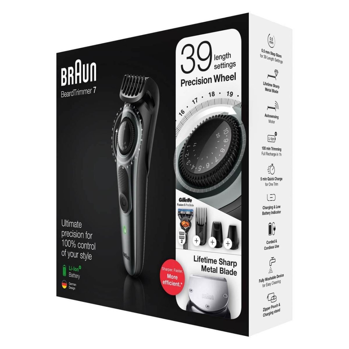 1 year international warranty Sharper, faster, more efficient vs. All previous generations of Braun Beard trimmers Precision dial for 39 length settings in 0.5 mm step sizes for an effortless trimming experience Lifetime Sharp metal blades for even beard trimming and hair clipping Create accurate lines and edges on neck and cheek with the main beard trimmer head German technology and ergonomic build, delivering 100 mins of cordless trimming on 1 hour charge