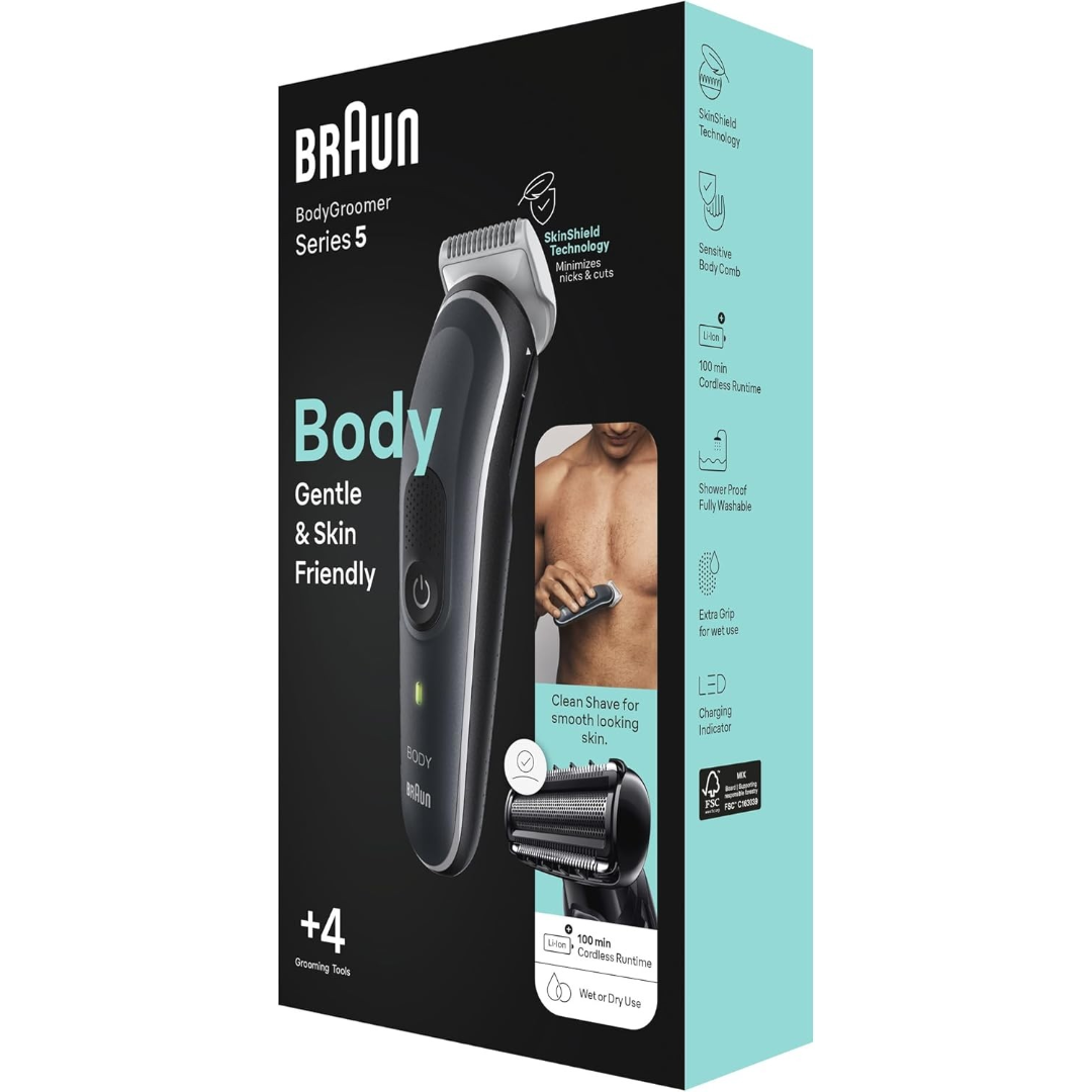 Braun Body Groomer 5360, for gentle full-body manscaping, even in sensitive areas. Quick hair removal from chest and armpits, to legs and groin. Experience comfort with SkinShield Technology and the sensitive comb. Get any length using the sliding combs or Clean Shave Head. The body groomer is 100% waterproof for easy cleaning with a 100-minute cordless runtime and lifetime-sharp blades. Includes: Fine pitch groomer head, clean shave head, sensitive comb, sliding beard comb (3 11 mm), fine pitch fix comb (1 mm). Box Content 1x Body groomer device 1x Fine pitch groomer head 1x Sensitive comb 1x Sliding beard comb (3 11 mm) 1x Fine pitch fix comb (1 mm). Great results, gentle on skin: built for quick and comfortable full body grooming from your chest and armpits to legs and groin with the Braun Body Groomer 5 Minimizes nicks & cuts for ultimate skin comfort: built-in SkinShield technology and the Sensitive Comb protect your skin while body trimming even in sensitive areas No matter the length: select the 1 mm fixed comb, 3-11 mm sliding comb or opt for the Clean Shave Attachment for smooth-looking skin Always ready to use: with a powerful Li-Ion battery and cordless 100-min runtime