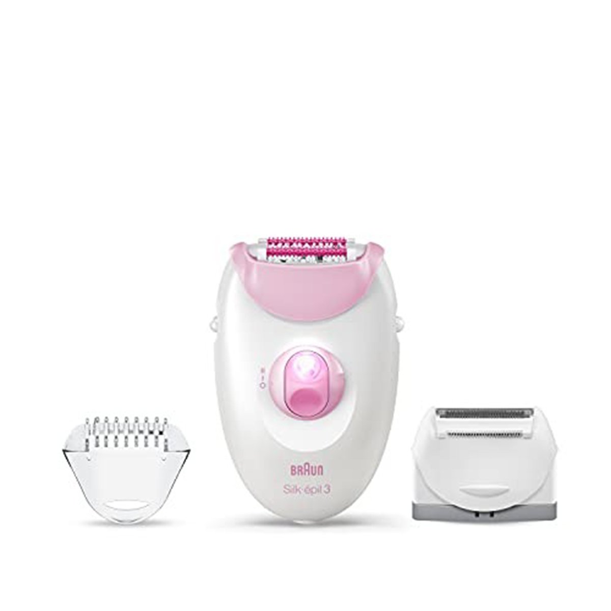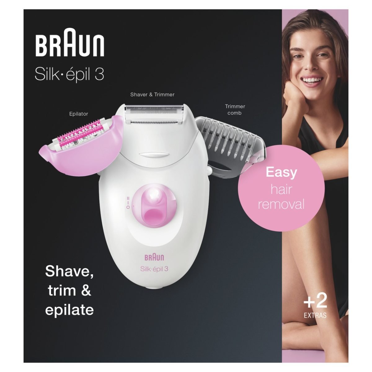 20-Tweezer System The 20 tweezers efficiently remove hairs by the root for long-lasting smoothness. SoftLift Tips The SoftLift Tips lift flat lying hair and guide it to the tweezers for easier removal. Massage rollers The Massage Rollers gently stimulate and massage your skin for even more comfort 2 speed settings Let you choose what s best for your individual skin type and personal beauty routine. Smartlight. Never miss a hair again A special feature of the Braun Silk-pil 3 is the Smartlight. It reveals even the finest hairs so you can make sure they are all gone. For a long, long time. Attachments Shaver head Allows you to use your epilator as a full-fledged dry shaver. Trimmer cap To trim hair in sensitive areas.