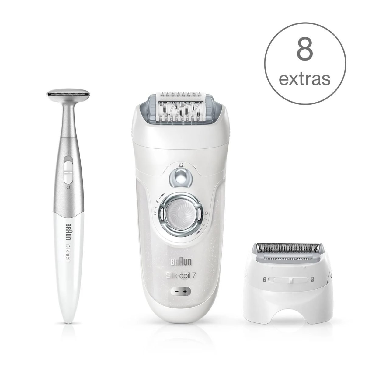 Close-Grip Technology 40 specially designed tweezers catch hair as short as 0.5 mm for superior efficiency. High Frequency Massage system Stimulates the skin for a more comfortable experience. Wet&Dry The Braun Silk-pil 7 epilator is 100% waterproof. For extra comfort and a soothing epilation experience in warm water you can confidently use it in the bath or in the shower. Choose your speed 2 speed settings for adaption to your individual skin type. SoftLift Tips The SoftLift Tips effectively lift even flat-lying hair and help guide them to the tweezers for removal. Skin contour adaptation Smoothly adapts to your body contours. Pivoting Head The pivoting head lets the Braun Silk-pil 7 follow every contour of your body for better skin contact and even gentler performance. Smartlight. See everything The Smartlight reveals even the finest hairs and supports extra thorough hair removal. Long-lasting battery Charges in only 1 hour for 40 minutes of use. 100% waterproof Easily clean under running water, comfortably use in bath or shower. Features dermatologically recommended Silk-pil epilators recommended* as the gentle solution to long-lasting hair removal thanks to its unique combination of skin-soothing features. *Dr. med. Petra Staubach, University Skin Clinic, Mainz Attachments Shaver head Allows you to use your epilator as a full-fledged dry shaver. Trimmer cap To trim hair in sensitive areas. Precision cap Perfectly fits to underarms and bikini areas. Efficiency cap Ensures maximum skin contact. Facial cap To remove unwanted facial hair.
