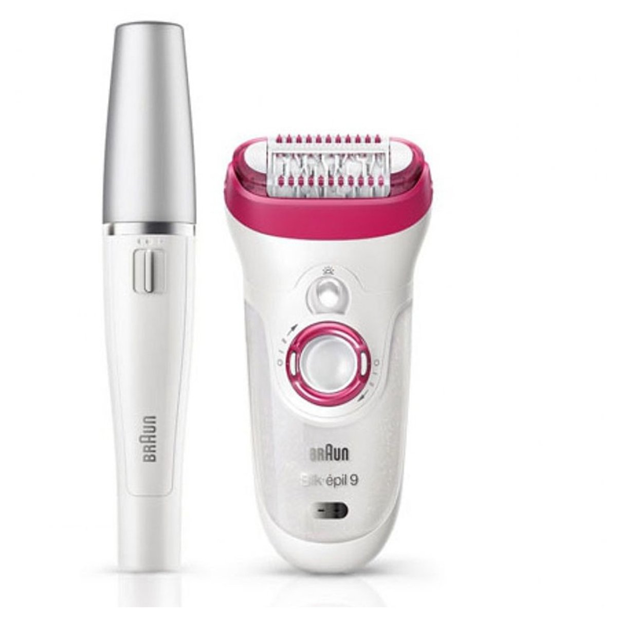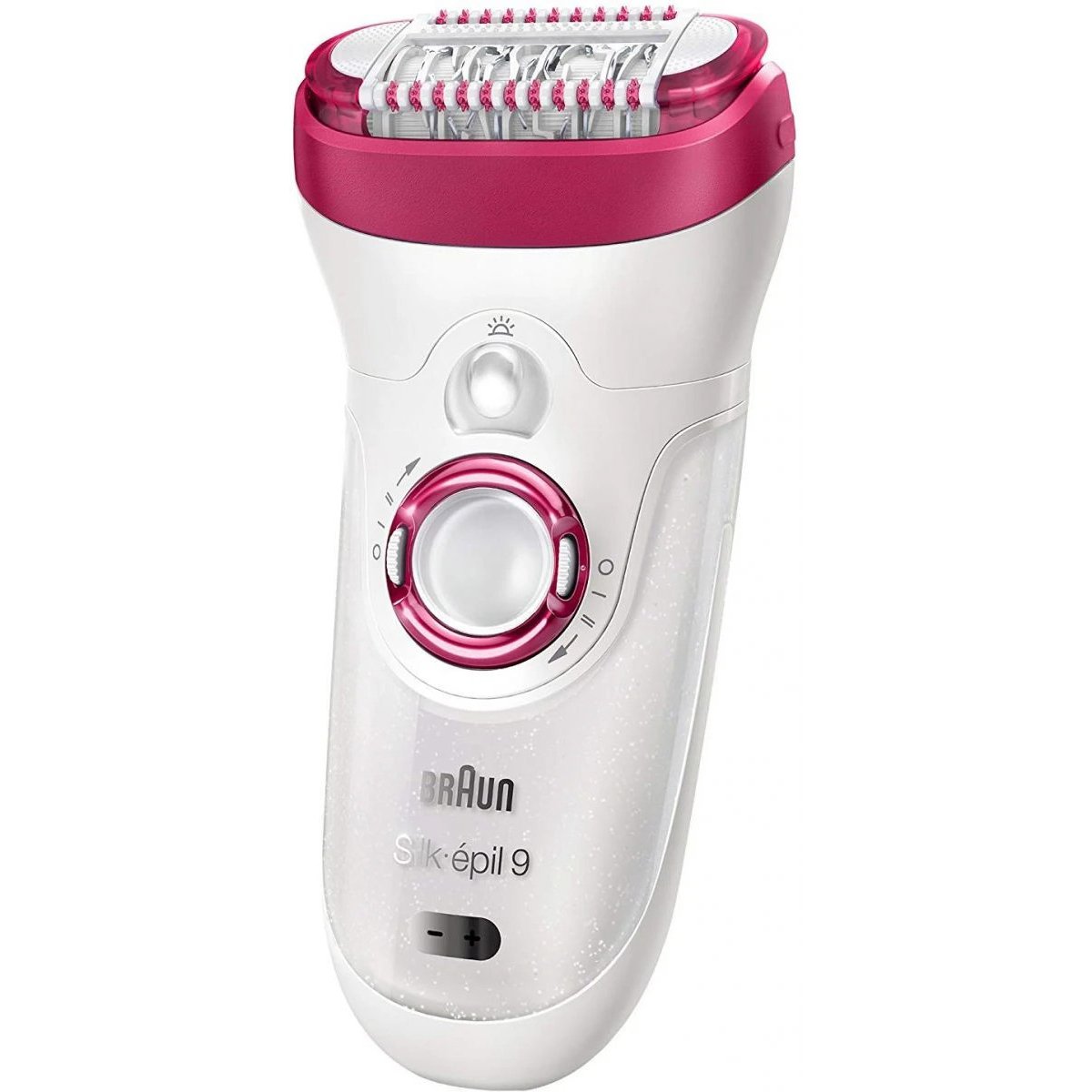 Features: Power source:Rechargeable 12V adapter Cleaning brush Colour:White/raspberry Extra wide head Braun Silk-pil 9 has a 40% wider head removing a lot more hair in one stroke for a faster epilation. A new standard of epilation so you can enjoy long-lasting smooth skin for up to 4 weeks. MicroGrip tweezer technology Featuring wider, longer and deeper tweezers the Braun Silk-epil 9 removes with precision even the shortest hairs that wax cannot catch (down to 0.5mm). So you will not have to wait anymore for your body hair to grow long enough for waxing. Break free from those in-between days, break free from hassle. High Frequency Massage system With pulsating active vibrations for an extra gentle epilation. Pivoting head Smoothly adapts to body contours for superior comfort and efficiency. Wet&Dry Works in bath or shower for a more comfortable epilation. Smartlight. See everything. The Smartlight reveals even the finest hairs and supports extra thorough hair removal. Long-lasting battery Charges in only 1 hour for 40 minutes of use. Use cordless in shower or bath. Skin contour adaptation Smoothly adapts to your body contours. 2 speed settings Speed 1 for extra gentle epilation, Speed 2 for an extra efficient epilation. 100% waterproof Easily clean under running water, comfortably use in bath or shower.