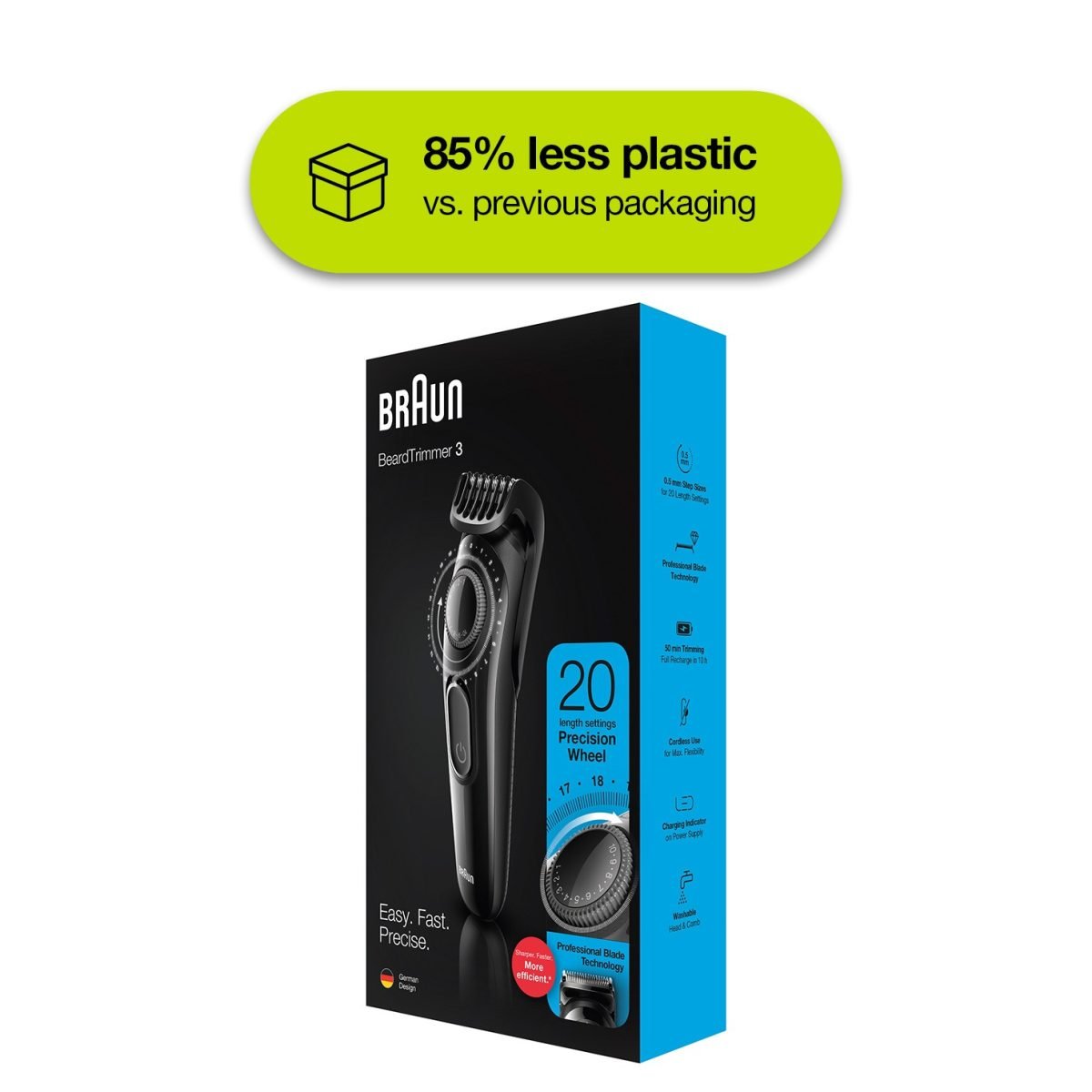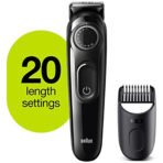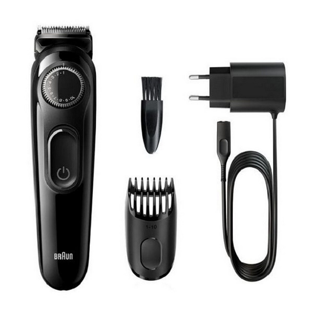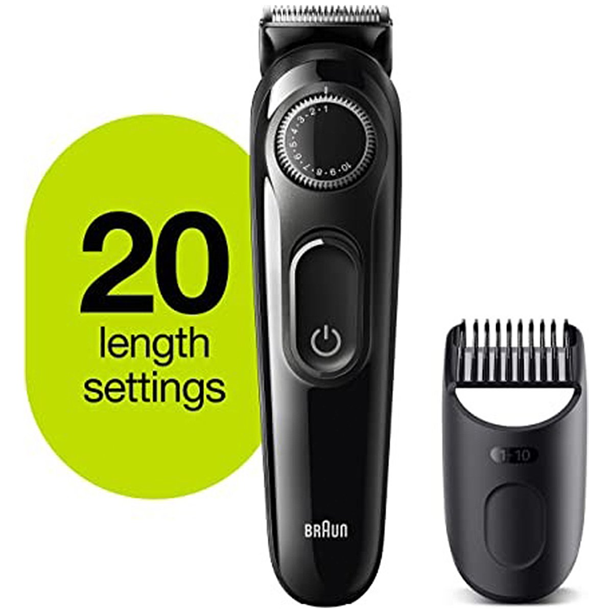 Sharper, faster, more efficient vs. All previous generations of Braun Beard trimmers Precision dial for 20 length settings in 0.5 mm step sizes for an effortless trimming experience Lifetime Sharp blades for even beard trimming and hair clipping Create accurate lines and edges on neck and cheek with the main beard trimmer head German technology and ergonomic build, for up to 50 mins of cordless trimming box includes: 1 x beard trimmer & Hair clipper 1 x trimmer comb 1 x smart plug charger 1 x cleaning brush user manual. Braun beard trimmer. Effortless precision for your style. Short to medium beards & hair clipping The short beard comb helps you maintain short to medium beards (0.5-10mm) and even clips your hair. Contour edging Create accurate lines & edges on neck and cheeks with the Braun beard trimmer head. Precision dial The precision dial offers 20 length settings from 0.5 10mm for any beard or hair style. Lifetime Sharp Blades Ultra sharp blades easily cut through long or thick hair without pulling and tugging. Long lasting battery power 50 mins of trimming. Full recharge in 10 hours. German design Ergonomic grip for intuitive use. It all adds up to an effortless trimming experience.