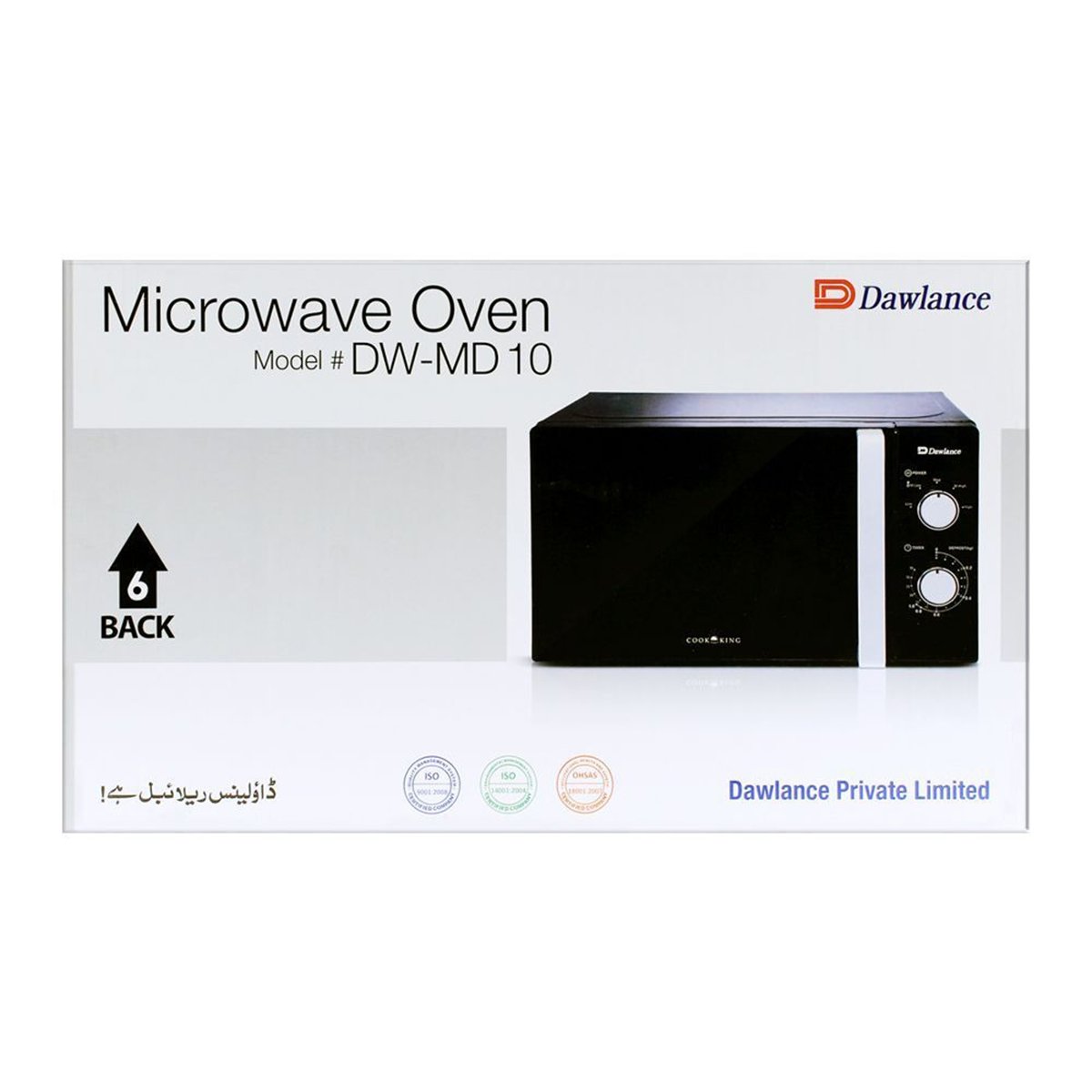 General BRAND DAWLANCE Model No. MD 10 Color Black Type Microwave Oven Capacity 20 Ltr Function 6 Powers Defrosting Yes Power Output 700W Timer Up to 35 Mins Convection MWO Yes Grill function No Handle Yes Panel Mechanical Child Lock Yes Door Style Mirror Glass Dimensions (WxDxH) 439x372x258 mm Weight 10 KG