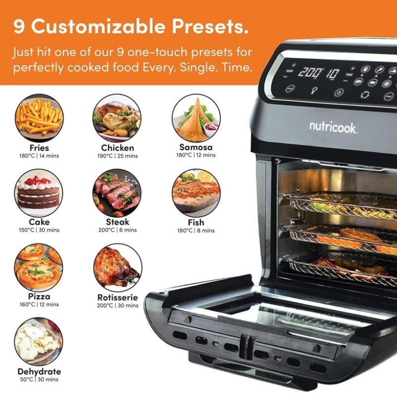 Meet the Nutricook Air Fryer Oven, the do it all kitchen superhero. Our Air Fryer Oven enables you to go beyond a single cooking style at the touch of a button. With a large 12L capacity and a sleek digital display, our Air Fryer Oven is incredibly versatile. Enjoy airfried guiltless pleasures, french fries, chicken wings and so much more. The convection function lets you roast a chicken or evenly bake multiple sheets of chocolate chip cookies at one go. Serve up delicious meat skewers with the Rotisserie preset. And dehydrate to turn the simplest of foods, like bananas or sweet potatoes, into healthy and delicious snacks!%Rapid Air Technology