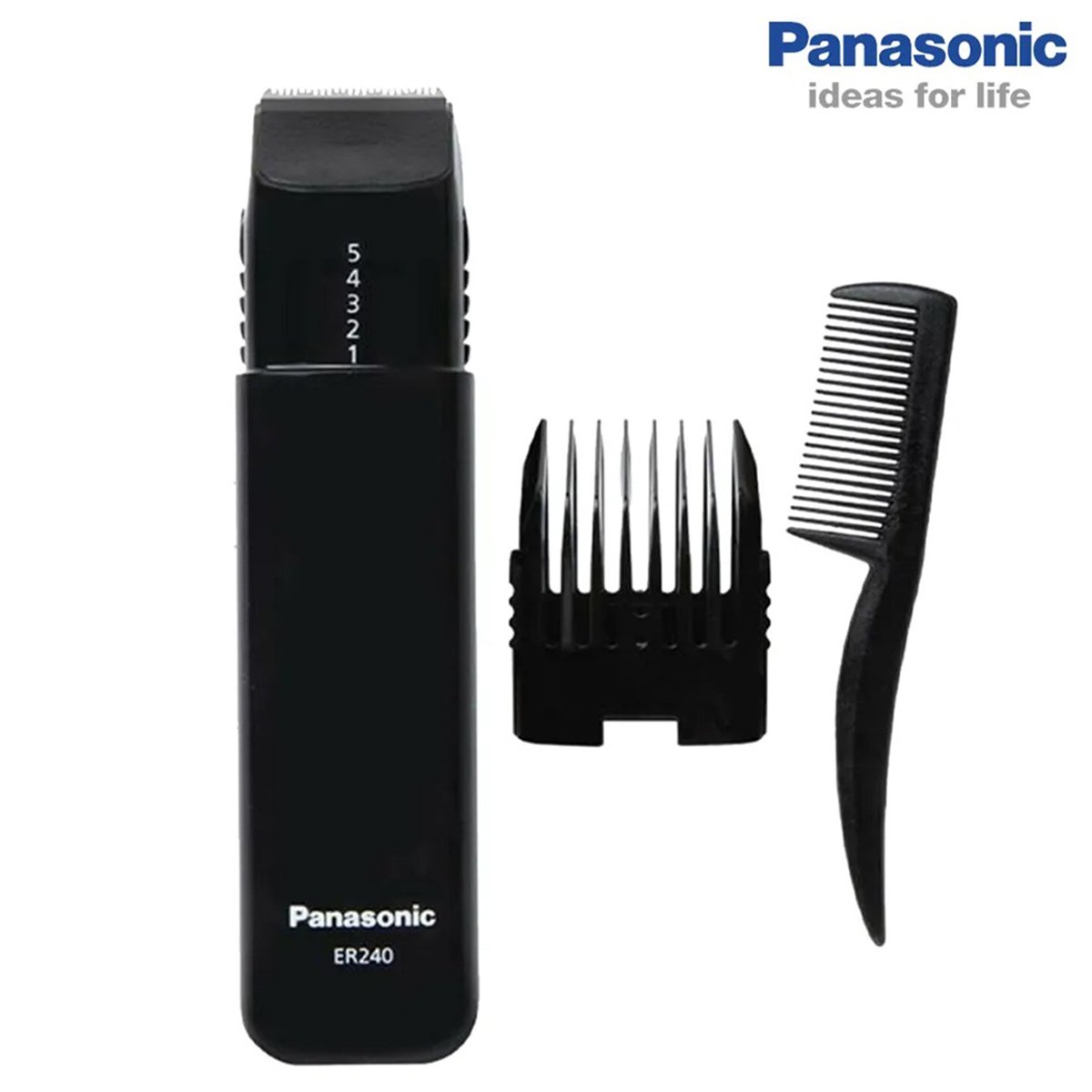 The ER240 is a men s trimmer from Panasonic that is specially made to give you an effective trimming result. This Panasonic men s trimmer allows you toexperiment with new styles every day. The Panasonic ER240 dry trimmer is ideal for trimming beard and moustache. Body The compactly designed Panasonic ER240 trimmer has a smooth finish and fits easily in your hand. Theergonomic grip of the Panasonic men s trimmerenhances easy manoeuvrability. You can simply dust the hair off the trimming head using the cleaning brush given with the Panasonic ER240 men s trimmer. The comb attachment allows you to choose a cutting length on this men s trimmer. Themoustache brushthat comes with the Panasonic ER240 trimmer helps you to comb your moustache before and after trimming. Features Featured with5 cutting length adjustments, this Panasonic ER240 men s trimmer lets you choose a suitable cutting length. The length adjustments range from 3 mm 15 mm in length for you to trim short, medium-length or long hair. The Panasonic ER240 features afloating cuttertype trimming head that adapts to all the curves of your face and neck. This Panasonic men s trimmer runs on battery and gives you anefficient cordless trim up to 45 minutes. The Panasonic ER240 men s trimmer gives you a precise cutting experience for a perfect and a groomed look.