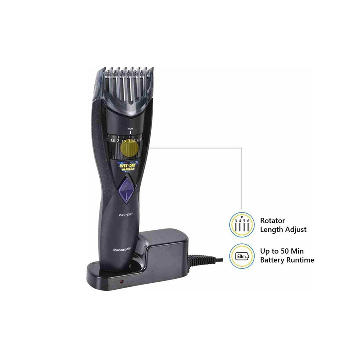 Specifications: Model Number ER-GB37 Wet/Dry Yes Quick adjust dial for easy length setting Turn dial to easily adjust comb up and down into 19 settings from 1-10mm.No need for multiple comb attachments. Precision cutting with a 45 edge Durable stainless steel blades with an acute 45 edge enable precise cutting. Sharp cutting edges quickly cut even thick and hard beard. Washable for easy & hygienic maintenance Drain allows water to flow freely though the unit for a quick and easy clean. Wet/Dry shaving without comb attachment Trims either wet or dry hair* for easy grooming at the sink or on-the-go. Enjoy the convenience of cordless operation.