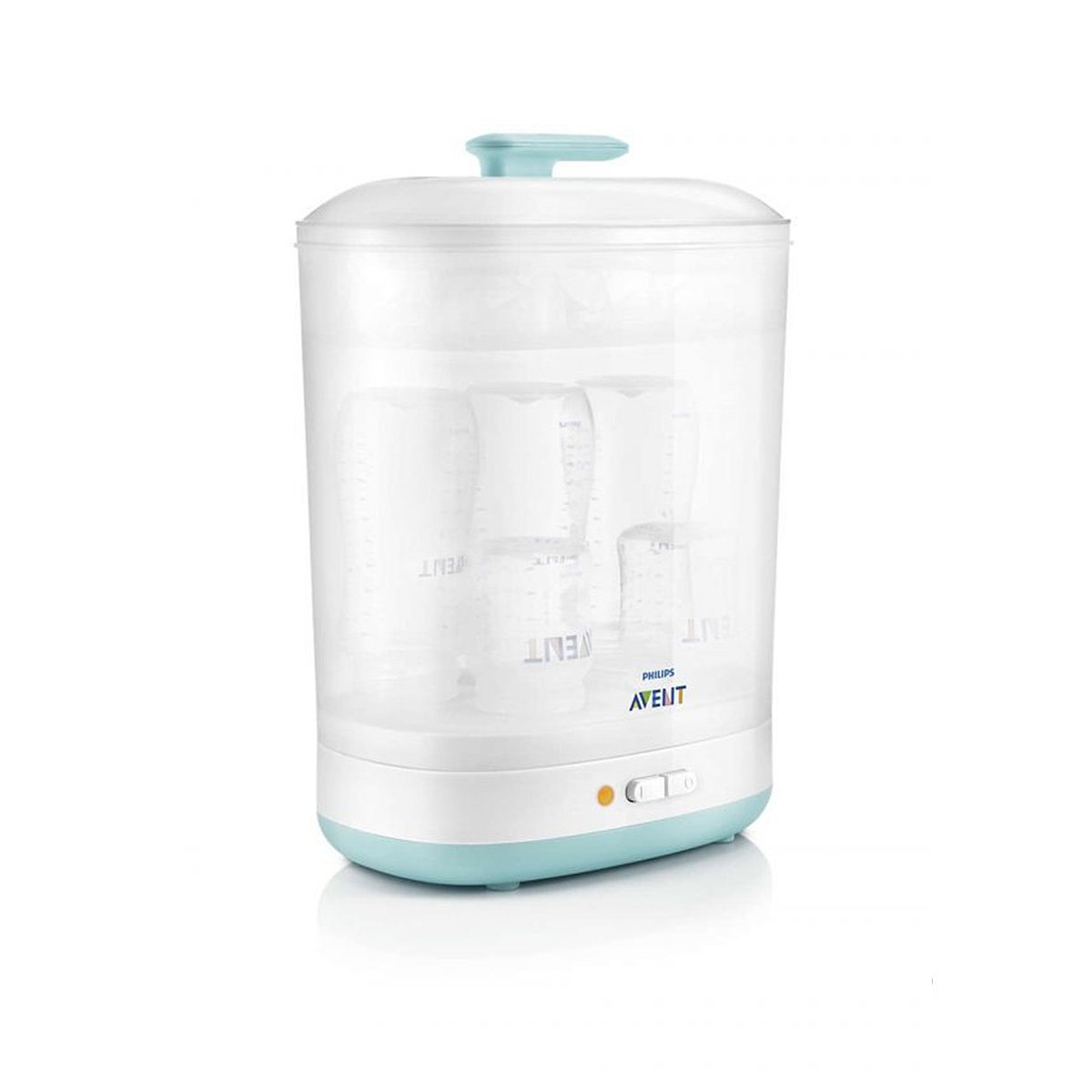 SPACE SAVING DESIGN Kills 99.9% of harmful germs Sterilizes in 10 minutes Fits 5 Philips Avent bottles Space saving 2-in-1 design 2-IN-1 STERILIZER DESIGN Efficiently sterilize your bottles and accessories, by putting teats, caps and soothers in the included small basket. The sterilizer also has a slender design that won t take up much space. NATURAL STEAM STERILIZING KILLS 99.9% OF HARMFUL GERMS The sterilizer uses natural steam to sterilize baby bottles and other products, killing 99.9% of harmful germs without using chemicals. Perfect for giving you peace of mind that all your baby bottles and other products are sterile. STERILE FOR UP TO 24 HOURS IF THE LID IS UNOPENED The sterilizer will keep its contents baby bottles, breast pumps etc sterile for up to 24 hours if the lid is unopened. FAST CYCLE AND AUTO SHUT OFF FUNCTION The sterilizing cycle lasts approximately 10 minutes, after which it switches off automatically. SPACIOUS DESIGN The sterilizer has a compact design yet cleverly fits up to 5 Philips Avent baby bottles at once. EASY TO CLEAN AND SAFE STERILIZING With our open design you can easily keep the heating plate clean, allowing you to sterilize with clean steam every time. CLEVER MULTI-FUNCTION LID DESIGN The sterilizer s lid has been cleverly designed so that it can be hung on the side of the sterilizer after use or used to take out and stand the baby bottles and other products on. STERILIZES VARIOUS BOTTLES, BREAST PUMPS & ACCESSORIES The sterilizer is suitable for use with both standard neck and wide neck baby bottles.It also fits other baby products likebreast pumps and accessories. Technical specifications Sterilization time 10 minutes Power consumption 600 W Safety Classification Class 1 Voltage 50-60Hz Weight and dimensions Dimensions 260x308x180 mm Weight 1.5 kg Country of origin Made in China Power Voltage 220-240 V Development stages Stages 0 6 months Compatibility Philips-Avent range compatible Yes Material Polypropylene Yes What is included Electric steam sterilizer 1 piece