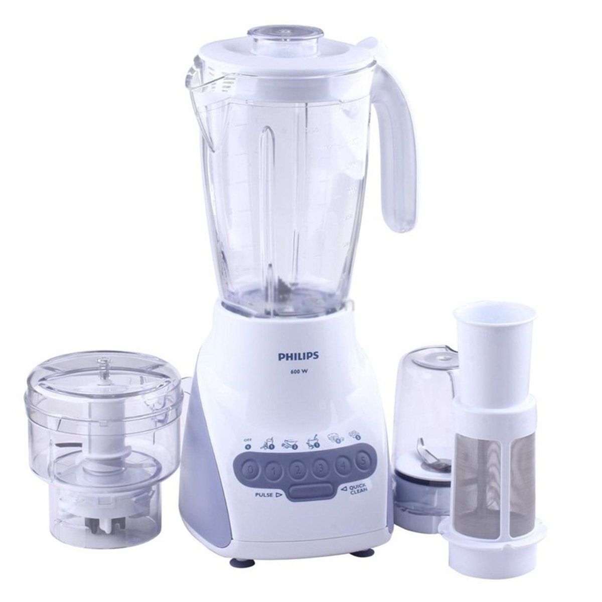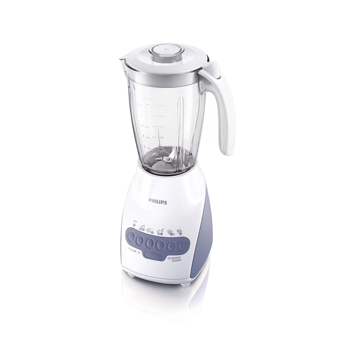 More than a blender Blend super smoothie,tasty soups and healthy juice 600W 2 L Plastic Jar 5 speed and pulse Powerful 600W motor Strong 600W motor for blending and mixing easily. Multiple speeds Blend at different speeds and to different degrees with a choice of settings. Ultra-sharp, long lasting serrated blades Crush and blend to perfection with these ultra-sharp, long-lasting serrated blades. Multi mill accessory Multi mill for grinding and chopping hard and soft ingredients. Detachable blade unit for easy cleaning Clean easily and effectively by removing the blade from the jar. Convenient filter accessory Keep seeds and pips out of your juice with this convenient filter. Chopper for chopping various ingredients The Philips blender accessory complete your blender. This chopper chops vegetables like onions, herbs, nuts and meat into fine pieces. Quick clean button One touch quick clean button to clean the jar and blade effectively. Easy cleaning soft touch panel Clean easily wipe out the surface. Specification: Design specifications Material housing Polypropylene (PP) Material blade Stainless steel Material blender jar SAN Color(s) White Accessories Chopper Yes Filter Yes Mill Yes General specifications Non-slip feet Yes Integrated cord storage Yes Speed setting 5 and pulse Technical specifications Power 600 W Effective jar capacity 1.5 L Frequency 50/60 Hz Capacity jar 2 L Voltage 220-240 V Cord length 0.85 m