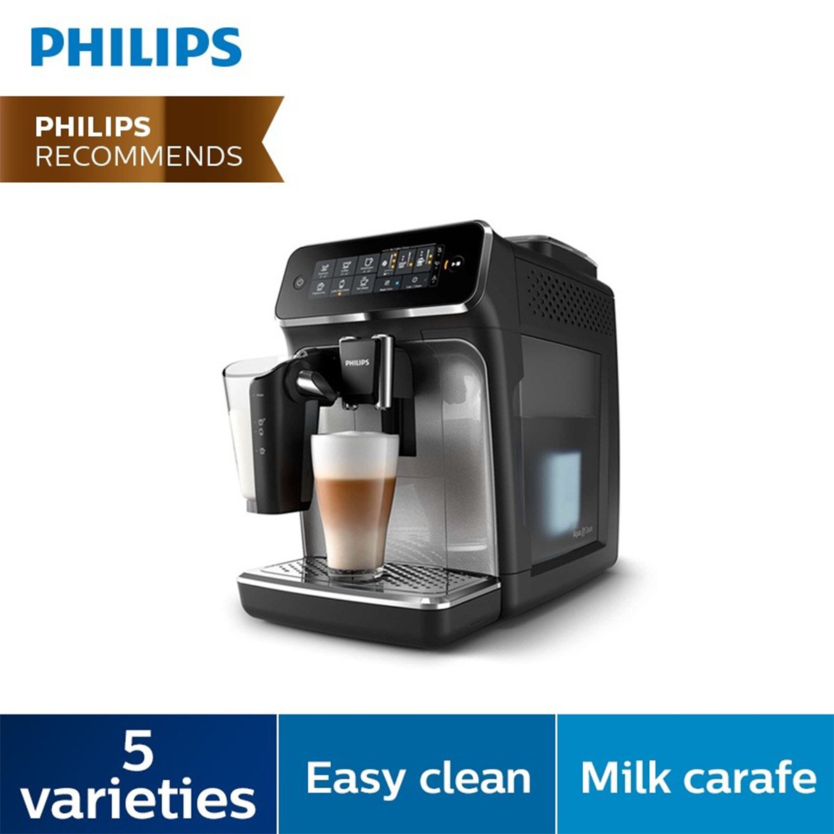 Specifications: Ease of cleaning & maintenance AquaClean filter compatible Milk Solution LatteGo User Interface Touch screen display Dishwasher safe parts Drip tray LatteGo Adjustable spout height 85-145 mm Capacity milk carafe 0.26 L Capacity waste container 12 servings Frequency 50 Hz Voltage 230 V Color & Finishing Black Silver Paint Cord length 100 cm Filter compatibility AquaClean Waste container Frontal access Water tank Frontal access Product dimensions 246x371x433 mm Coffee bean capacity 275 g Capacity water tank 1.8 L Pump pressure 15 bar Aroma Strength Settings 3 Grinder Settings 12 Pre Brew Aroma control Yes Temperature settings 3 Coffee and Milk Length Adjustable Coffee Powder Option Yes Double Cup Yes Milk Double Cup No Removable brew group Yes Aroma Seal yes Guided descaling yes AquaClean Yes CO setting Yes Energy label A-class Power consumption brewing 1500 W Beverages Espresso Hot water Cappuccino Coffee Latte Macchiato Americano Enjoy 5 coffees at your fingertips, including cappuccino Enjoy your favourite coffees for your special moments. Whether you crave for an espresso, a coffee or a milk based recipe, your fully-automatic espresso machine delivers a perfect in-cup result with no hassle and in no time! Silky smooth milk froth thanks to high speed LatteGo system Top your coffee off with a silky-smooth layer of milk froth. The LatteGo mixes milk and air at high speed in the round frothing chamber, then adds a splash-free, creamy layer of milk froth to your cup at just the right temperature. Easy selection of your coffee with intuitive touch display The irresistible taste and aroma of coffee from fresh beans is just one touch away. Our intuitive touch display allows you to easily select your favorite coffee. Adjust aroma strength and quantity via My Coffee Choice Adjust the strength and quantity of your beverage with the My Coffee Choice menu. Easily choose from three different settings to suit your preferences. Easily adjust to your taste with 12-step grinder levels Our durable ceramic grinders can be adjusted in 12 steps, so you can turn your beans into anything from ultra-fine powder to coarse grindings. The perfect temperature, aroma and crema cup after cup The Aroma Extract system intelligently strikes the optimum balance between brewing temperature and aroma extraction by keeping the water temperature between 90 and 98 C, while regulating the water flow rate, so you can enjoy delicious coffees. 20,000 cups of finest coffee with durable ceramic grinders Our grinders are 100% pure ceramic: extremely hard and precise, so you can enjoy fresh aromatic coffee, for at least 20.000 cups. LatteGo is exceptionally easy to clean: 2 parts, no tubes Our 2 parts milk system has no tubes or hidden parts and can be cleaned in as little as 15 seconds under tap* or in the dishwasher. Up to 5000 cups* without descaling thanks to AquaClean By changing the filter after being prompted by the machine, you will not need to descale your machine for up to 5000 cups*, while enjoying clear and purified water. Easy cleaning thanks to fully removable brew group The brew group is the heart of every fully automatic coffee machine, and should be cleaned regularly. The removable brew group allows you to clean it thoroughly just by rinsing it under the tap. Keep your beans fresh for longer thanks to the aroma seal The new Aroma seal protects your favorite coffee beans and makes sure they preserve their original aroma over time, while reducing the grinder noise. Dishwasher safe parts for your convenience For your convenience, you can put the milk system, drip tray and the coffee ground container in the dishwasher. This will save time and ensure a hygienic cleaning.