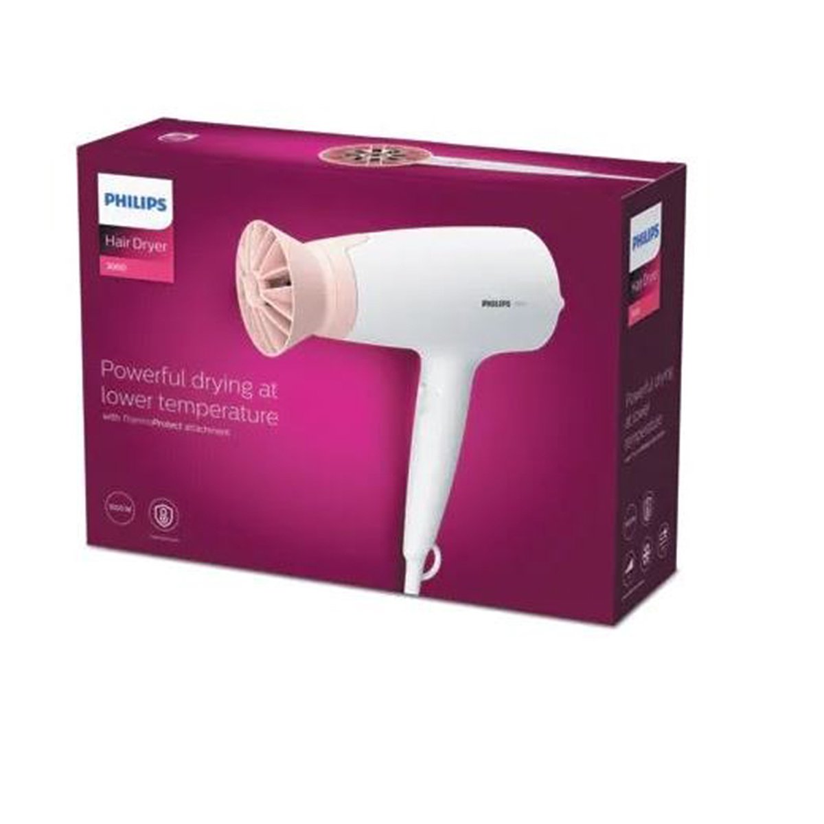 1600W of drying power This 1600W hair dryer creates the optimum level of airflow, for beautiful results every day. ThermoProtect attachment The uniquely-designed ThermoProtect attachment powerfully mixes warm and cool air for everyday care. It drops the temperature by 10 C while still drying your hair quickly. 3 heat and speed settings This hairdryer offers 3preselected heat/speed combinations, making it quick and easy to achieve the perfect style. Cool air setting to finish your style The cool air setting provides a burst of cold air to finish and hold your style. Slim nozzle for touch-ups and detailed styling The slim nozzle precisely focuses the air for quick touch-ups and perfecting small details of your style. Technical specifications Cord length 1.8 m Wattage 1600 W Voltage 220-240 V Motor DC Features Storage hook Yes Heat/Speed settings 3 Settings Cool air setting Attachments Nozzle 14 mm ThermoProtect attachment Yes Service 2-year worldwide warranty Yes Caring technologies ThermoProtect Yes