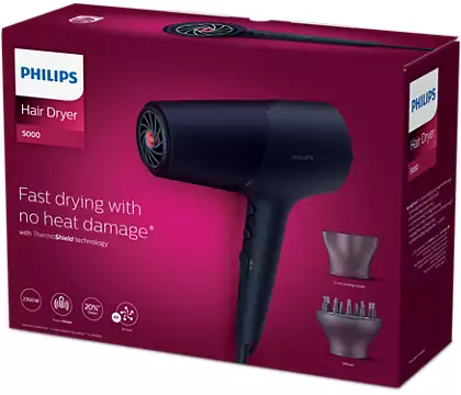 Fast drying with no heat damage with ThermoShield technology 2300W ThermoShield technology 4x ionic care* 3 heat & 2 speed settings ThermoShield technology for ultimate heat protection The overheat detect sensor actively optimizes and controls the air temperature, protecting your hair from damage** caused by overheating. Enjoy a stress-free drying experience with ThermoShield technology. 20% faster drying with a powerful 2300W airflow A more powerful airflow of 2300W makes drying 20% faster, while still protecting your hair. A powerful motor creates air speeds of up to 110 km/h This hairdryer s high-performance motor has been developed for the professional market. It generates an air speed of up to 110 km/h, for fast drying and impressive styling. 4x ionic care for shiny, frizz-free hair This ultra-powerful ionic system emits up to 80 million ions per drying session, creating frizz-free, shiny hair. Precise control with 6 heat and speed settings Easily pick the combination of heat and speed that works best for your hair and style. Six different settings ensure precise control for tailored styling. Cool Shot to set your style The Cool Shot button provides an intense burst of cool air. It is used after styling to finish and set the style. Slim nozzle for touch-ups and detailed styling The slim nozzle precisely focuses the air, for quick touch-ups and perfecting small details of your style. Technical Specifications Attachments Nozzle 11 mm Volume diffuser Yes Technical specifications Cord length 1.8 m Wattage 2300 W Voltage 220-240 V Motor DC Color / Finishing Blue & Metallic