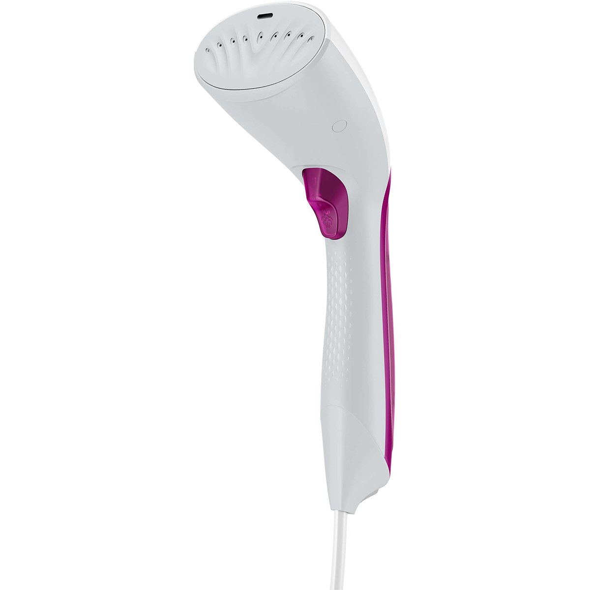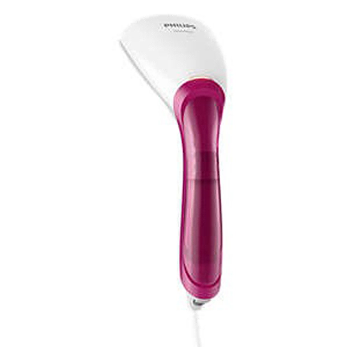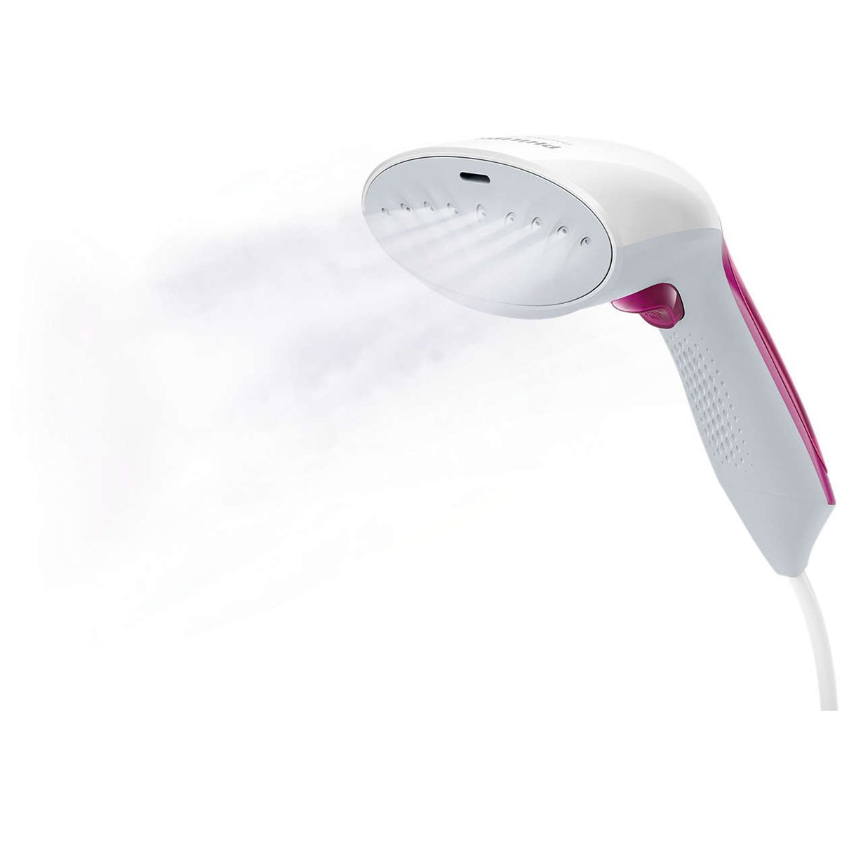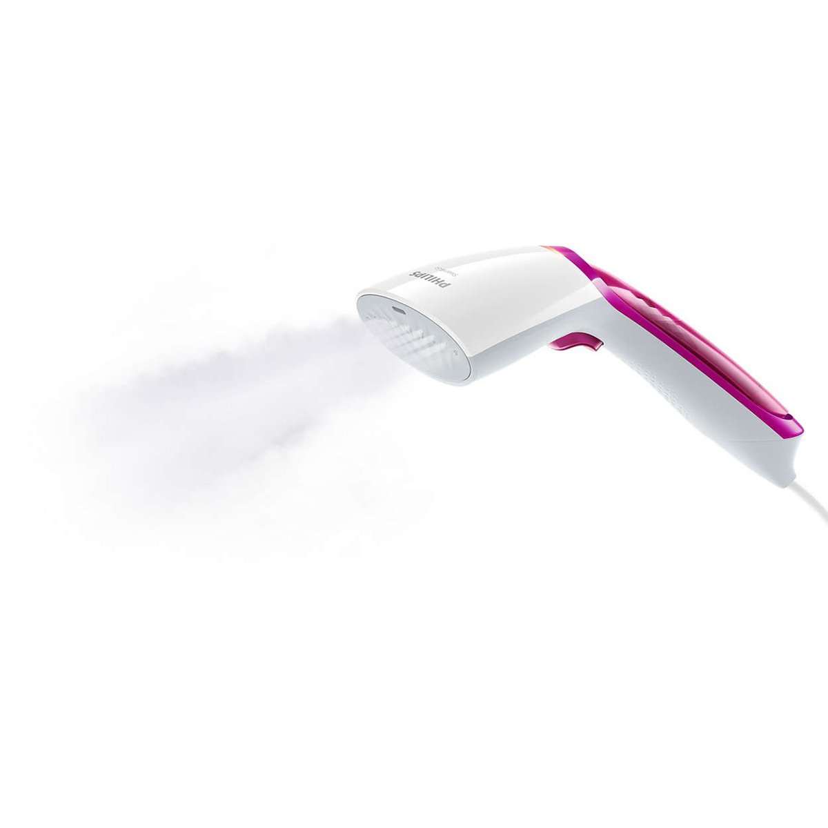 Compact solution for easy de-wrinkling This handheld garment steamer is perfect for delicate fabrics, difficult-to-iron areas and to refresh any clothing or upholstery no burns guaranteed. Lightweight and compact design makes it easy to use anytime anywhere. Just steam and go Automatic continuous steam for easy de-wrinkling An electric pump automatically provides continuous steam for easy and quick de-wrinkling. Brush accessory for thicker fabrics The brush attachement opens the fabric fibers and enables better steam pemetration. It is especially good for thicker garments like jackets and coats. It can also help remove dirts and pills. Safe on all ironable fabrics, no burns guaranteed The steamer is safe to use on all ironable fabrics and garments. The steam plate can be safely pressed against any clothing with no risk of burning a great solution for delicate fabrics, like silk. No ironing board needed Using a clothes steamer on hanging garments eliminates the need for an ironing board, so de-wrinkling is easy and hassle-free. Compact design for convenient use, storage and travel The handheld garment steamer is ergonomically designed to be light, compact and comfortable to use. Just press the trigger and watch wrinkles and creases disappear. Detachable water tank for easier filling The water tank detaches for easy filling under the tap. 2.5m cord for longer reach for longer reach Continuous steam removes odors and kills 99.9%* of bacteria Hot steam refreshes your clothes and kills up to 99.9% of bacteria*. Less frequent washing and dry cleaning saves time and money, and helps clothes last longer. Specifications: Fast crease removal Continuous steam Up to 20 g/min Power 1000 W Ready to use <1 min Voltage 220-240 V Easy to use Safe on all ironable fabrics Even delicates like silk Water tank capacity 70 ml Detachable water tank Yes Power cord length 2.5 m Ready to use Light indicator Refill any time during use Yes Accessories included Brush Yes Glove for extra protection Yes Size and weight Packaging dimensions (WxHxL) 38 x 12.8 x 15 cm Green efficiency Product packaging 100% recycable User manual 100% recycled paper