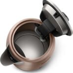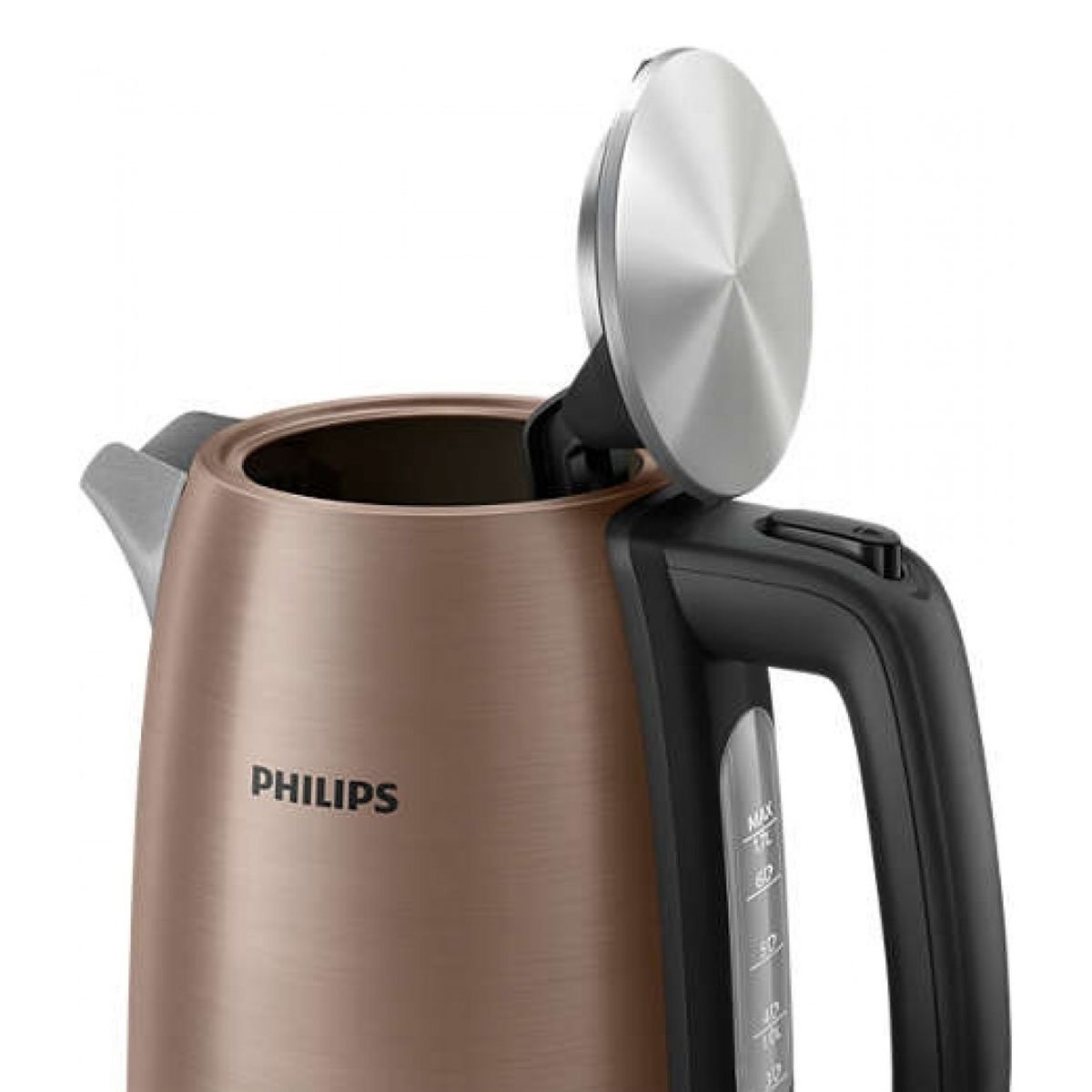 Enjoy hot drinks anytime With keep warm function Metal Spring lid Light indicator 1.7 L Cord winder for easy adjustment and storage The cord can be wrapped underneath the base, so it s the right length for any kitchen and easily stored away. Easy refilling through lid or spout The kettle can be filled through the spout or by opening the spring lid. Keep warm function with no reboiling The keep warm feature maintains the water in your kettle at a selected temperature so you don t need to reboil. Cordless kettle with 360 pirouette base The cordless kettle sits on a 360 pirouette base for easy lifting and replacing. Flat heating element for fast boiling A concealed stainless steel heating element ensures fast boiling and easy cleaning. Easy-to-read water level indicator The water level is easy to read with an indicator located underneath the handle. Multi safety system against boil-dry The kettle shuts off automatically when the water is ready, when it is lifted from the base or when there is too little water. Spring lid with large opening for cleaning A push-button lid opens smoothly at the touch of a button, avoiding steam contact. The large opening simplifies cleaning. Pilot light indicates when the kettle is switched on Elegant indicator light incorporated in the power switch indicates illuminates when the kettle is turned on. Durable full stainless steel body for long life Durable full-metal design in food-grade brushed stainless steel for long, reliable use. Stainless steel spill-proof spout Spill-proof spout is made of food grade stainless steel and efficiently prevents water spilling out, ensuring safe boiling and clean cup of water at all times. Specification: 2-year worldwide guarantee:Yes Power:1740-2060 W Product features 360 degrees base Automatic shut-off Boil-dry protection Cord storage Flat heating element Non-slip feet On/off switch Pilot light Spring lid Wide opening lid Technical Specifications General specifications Product features 360 degrees base Automatic shut-off Boil-dry protection Cord storage Flat heating element Non-slip feet On/off switch Pilot light Spring lid Wide opening lid Cordless:Yes Easy spout filling:Yes Lid as well as spout filling:Yes Service 2-year worldwide guarantee:Yes Sustainability Packaging:> 90% recycled materials User manual:100% recycled paper Technical specifications Frequency:50/60 Hz Power:1740-2060 W Voltage:220 240 V Capacity:1.7 L Design Color:Copper Finishing Material of main body:Stainless steel Material power switch:Polypropylene (PP)