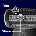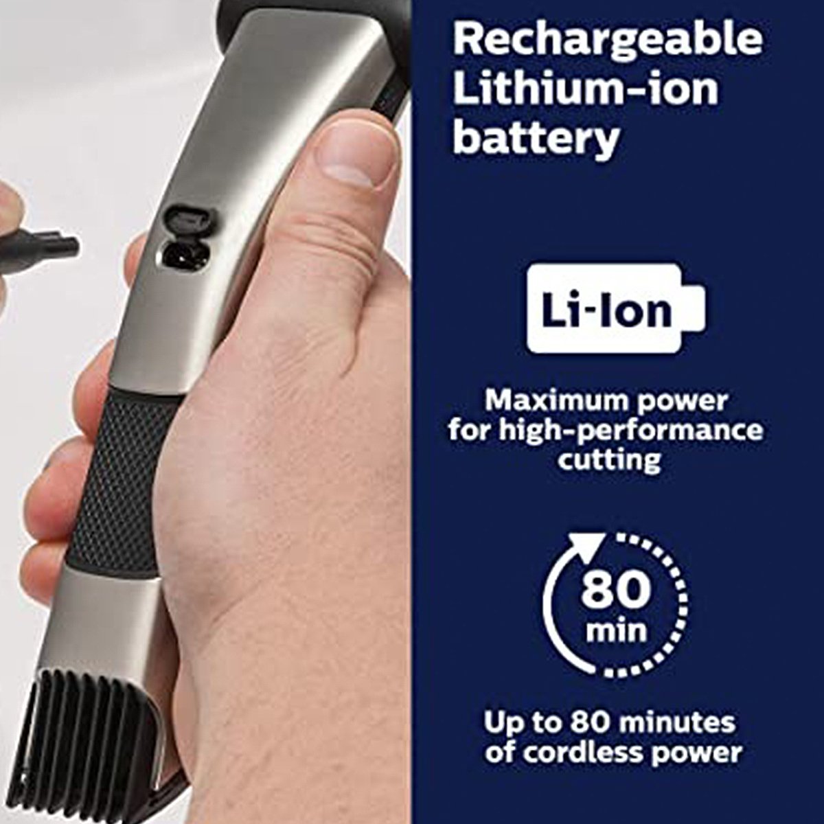 2 years brand warranty Trimmer for face, head and body Dual sided design to shave or trim all body zones while wet or dry 5 adjustable lengths and self-sharpening blades Rechargeable Lithium ion battery with 80 minutes of cordless use after a 1-hour charge