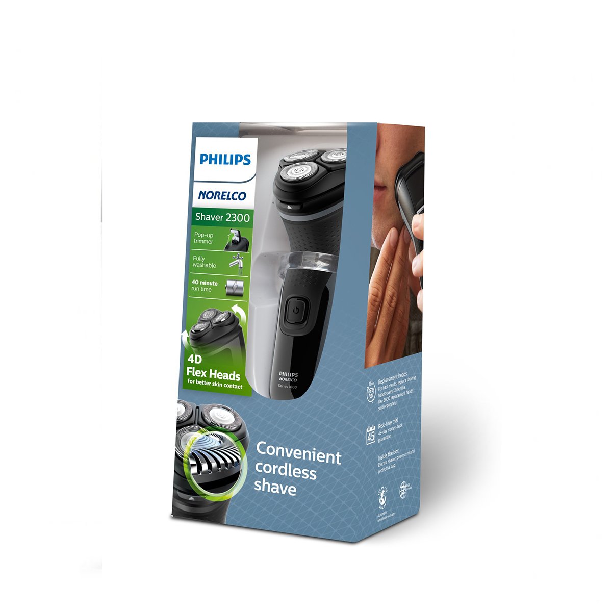 Philips Norelco Shaver 2300 gives you a consistent, convenient clean shave. Self-sharpening ComfortCut blades, a pop-up trimmer and full-washability make the shaver easy to use and excellent value. Glides over skin for a smooth and even shave Get a clean, comfortable shave with this Philips shaver. This electric shaver s 27 ComfortCut blades cut each hair right above skin level to give you a smooth and even finish. Follows the contours of your face This dry shaver is designed to maintain even contact with your skin without nicking it. The 4D Flex Heads flex and float in 4 directions for a clean shave every time. Even-up your mustache and sideburns Refine and define your mustache and sideburns with the pop-up trimmer and complete your look with ease. One-touch open for easy cleaning Clean your electric shaver with the touch of a button. Simply flip open the shaver head and rinse with water. 40 minutes of cordless shaving from an 8-hour charge Use your shaver at home or on-the-go for up to 40 minutes on an 8 hour charge that s around 13 shaves. Or plug it in for instant and continuous power. Use with or without a cord Use your convenient cordless shaver for tangle-free grooming. Or plug it in for a reliable corded shave when the battery is empty.