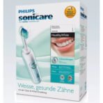 The ultimate toothbrush for whiter teeth 2 modes 1 brush head Sonicare dynamic cleaning action drives fluid between teeth Philips Sonicare electric toothbrush s unique dynamic action gently and effectively reaches deep between teeth and along the gumline. Two-minute timer helps ensure recommended brushing time 2-minute timer on this Philips Sonicare electric toothbrush helps ensure dental professional recommended brushing time Quadpacer interval timer encourages thorough brushing 30 seconds interval timer indicates when you have completed each quadrant of your mouth and signals for you to move on resulting in more consistent cleaning throughout your mouth Easy-start program to acclimate to the Sonicare experience Gently increases power over first 14 uses to ease into the Philips Sonicare electric toothbrush experience Clean and White Mode: proven to remove stains 2 minutes of Clean mode with an additional 30 seconds of White mode to focus on the visible front teeth. Removes everyday stains, such as coffee, tea, tobacco and red wine. Whitens teeth by 2 shades in just 2 weeks.* Philips Sonicare toothbrush helps whiten teeth This Philips Sonicare electric toothbrush helps to remove and reduce stains on your teeth for a brighter smile. Removes up to 2x more plaque than a manual toothbrush Patented Sonic Technology removes up to 2x more plaque than a manual toothbrush. Technical Specifications Items included Brush heads 1 ProResults standard Charger 1 Handles 1 HealthyWhite Modes Clean For exceptional everyday clean Clean & White 2 min Clean + 30 sec White Ease of use Battery indicator Light shows battery status Brush head system Easy click-on brush heads Handle Slim ergonomic design Rubber grip for easy handling Brushing time Up to 3 weeks** Power Voltage 110-220 V Design and finishing Color Glacier Green Cleaning performance Health benefits Helps improve gum health Performance Removes up to 90% of stains* Speed Up to 62000 brush movement/min Timer Quadpacer and SmarTimer Whitening benefits Whitens teeth up to 2 shades Service Warranty 2-year limited warranty Technical specifications Battery Rechargeable Operating time (full to empty) Up to 3 weeks** Battery type Lithium ION