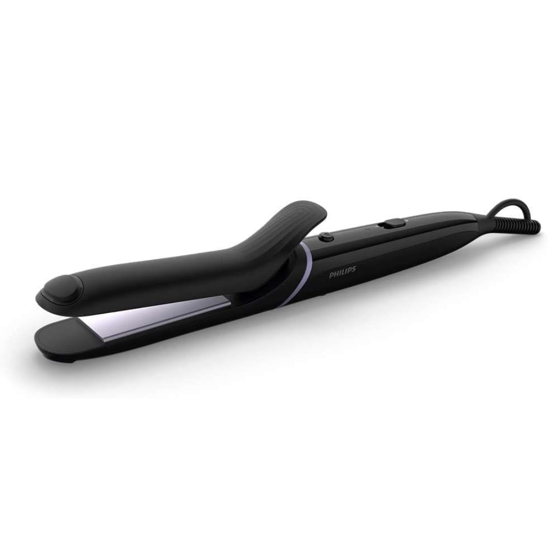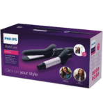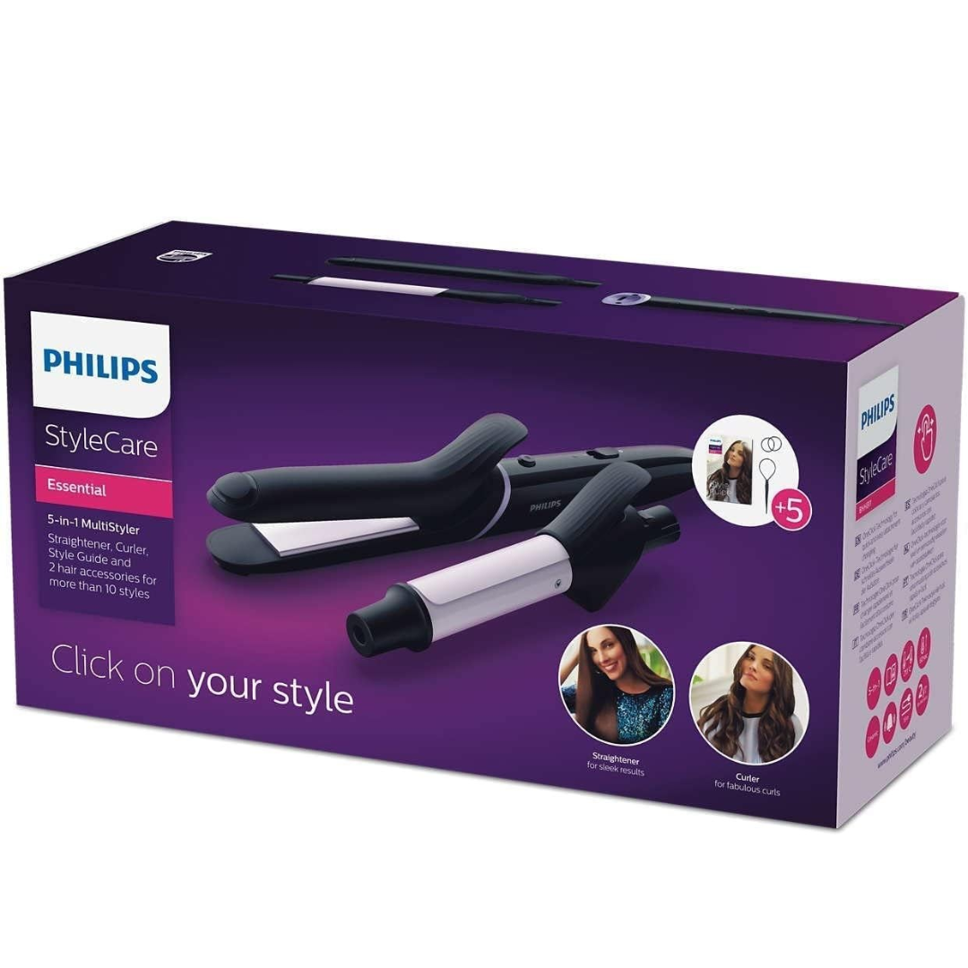 Every day a different look! From to perfectly polished, straight and curly hair to updos and more, create more than 10 styles with the new Philips Multi-Styler with style guide Product Features 80mm straightener for sleek results 80mm straightening plates for perfect sleek results. 25mm curling barrel for tight to loose curls 25mm curling barrel for perfect tight to loose curls. Style guide and 3 useful hair accessories for 10+ styles Including a style guide to create 10+ styles, 2 elastic bands for easy hairstyling and a hair loop to experiment with your style. OneClick Technology for quick and easy attachment changing Changing attachments has never been quicker or easier with the muti-styler s OneClick design. Simply click on and push the button, holding the cool tip, to release. Professional high heat for perfect results This high temperature enables you to change the shape of your hair and gives you that perfect look you want. Fast heat up time, ready to use in 60 sec This styler has a fast heat up time, being ready to use in 60 seconds. Protective ceramic coating Protective ceramic coating ensures even heat distribution and less hair damage for shiny and soft hair. Cool tip for easier and safer use The tip of the styler is made from a special heat insulating material to keep it cool; you can safely hold it while you re styling for optimal ease of use. 1.8 m power cord Convenient to use thanks to the 1.8m power cord length. Swivel cord to prevent tangled wires Useful swivel cord technology rotates the cord to prevent tangled wires.
