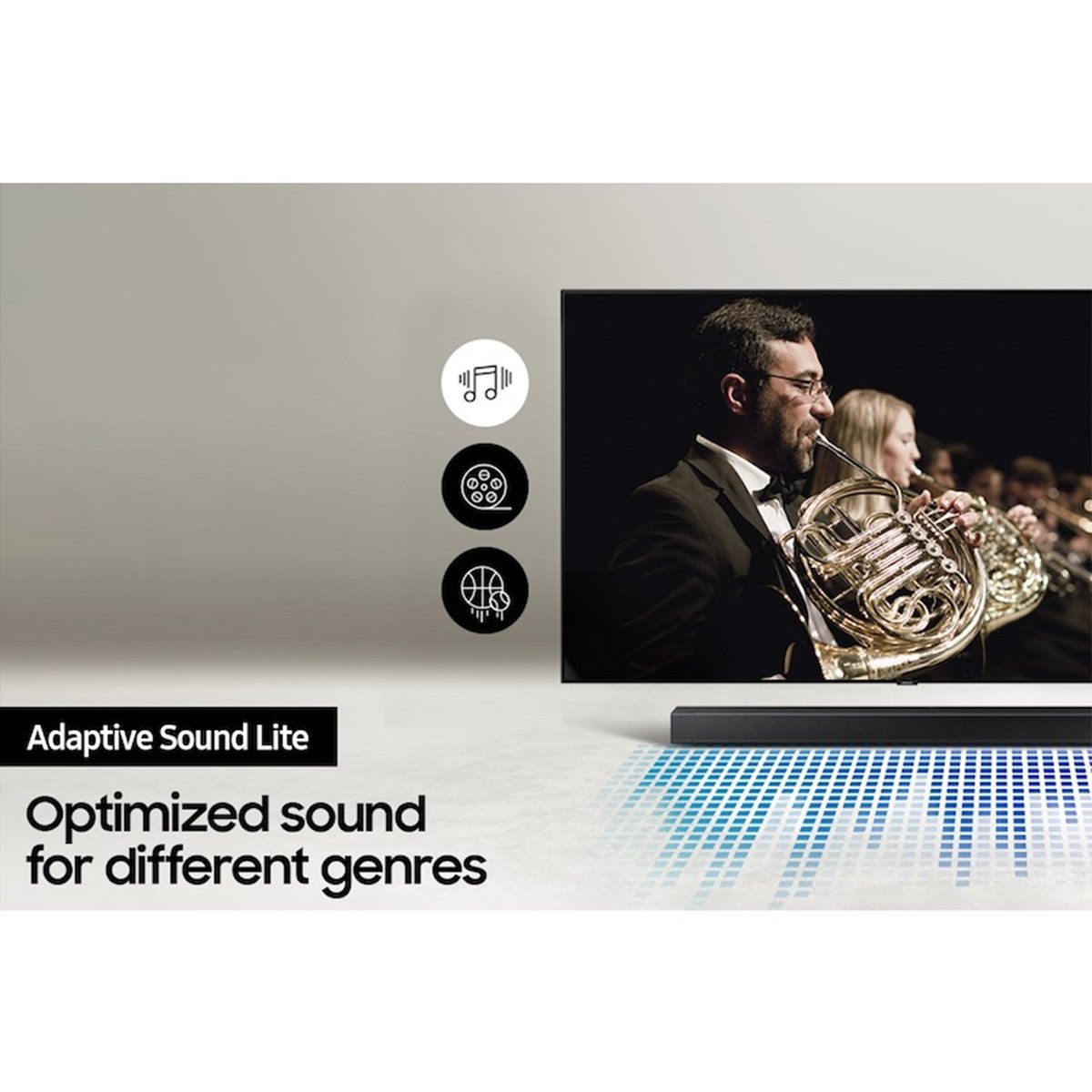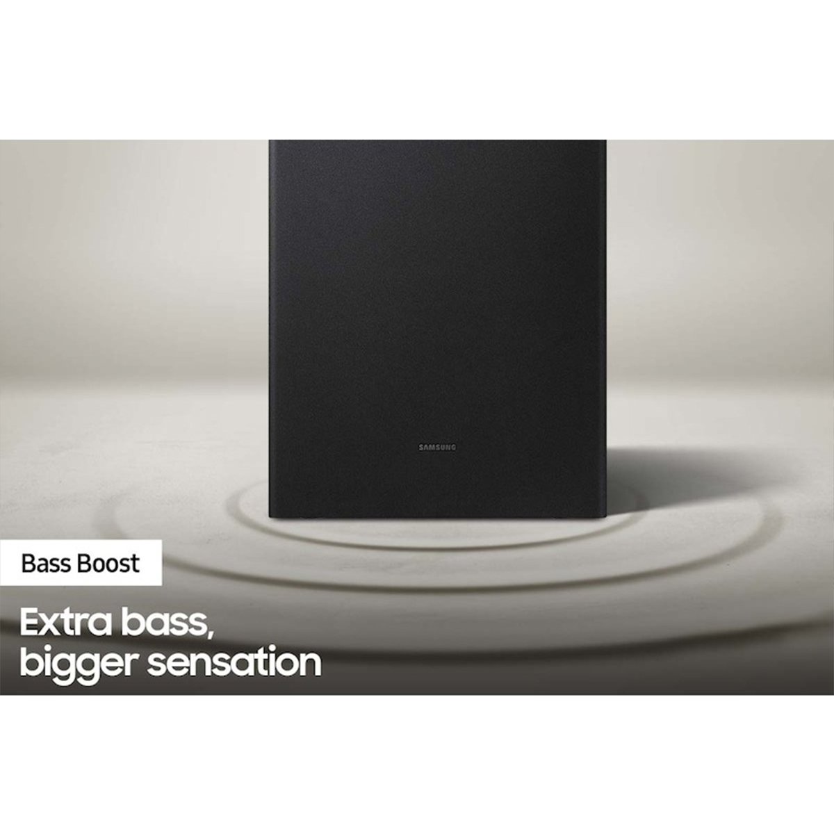 General Color Black Number of Channels 2.1 Total Power (W) 300W Special Features Compatible with SWA-9000S/9100S Audio Processing Dolby Dolby 2ch DTS DTS 2ch Audio Features Sound Mode Surround Sound Expansion, Game, Standard, Adaptive Lite, Bass Boost Wireless Surround Sound Ready Yes Speakers Number of Speakers 3 Subwoofer Included Yes Subwoofer Type Wireless AV Decoding Format WAV Yes MP3 Yes WMA Yes OGG Yes FLAC Yes AAC Yes AIFF Yes Yes Yes Connectivity Optical Inputs 1 USB Music Playback Yes Bluetooth Yes BluetoothPower On Yes Bluetooth Power On Yes One Remote Control Yes Power Consumption Stand-by Power Consumption (Main) 0.5W Stand-by Power Consumption (Subwoofer) 0.5W Operating Power Consumption (Main) 25W Operating Power Consumption (Subwoofer) 40W Free Voltage Yes Rated Voltage Yes Energy Star Yes Accessory Remote Control Yes Wall Mount Kit Yes Battery for Remote Controller Yes Cable Included Optical Discover deep, rich like nothing before Turn up the bass with a wireless subwoofer, which comes included with your soundbar. Elevate your sound experience Sound you can feel. Sound that moves you. Hear the difference a soundbar can make when paired with a Samsung TV. Extra bass, bigger sound Give your bass an instant boost with the push of a button on the soundbar. Adaptive Sound Lite Enjoy optimized sound for your favorite video content, including sports, games, movies and more with technology that equalizes background music and consistent volume control. Bluetooth TV Connection Set up is a breeze. Easily connect your soundbar to your TV by connecting wirelessly. Game Mode Boost your gaming experience with perfectly synced directional audio that moves with the on-screen action and crosstalk cancellation that minimizes distractions. One Remote Streamline control of both your Samsung TV and soundbar with just the Samsung TV remote. Wireless Surround Sound Compatible Turn your soundbar into a complete surround sound system with optional rear Samsung speakers in a few simple steps without the mess of wires.