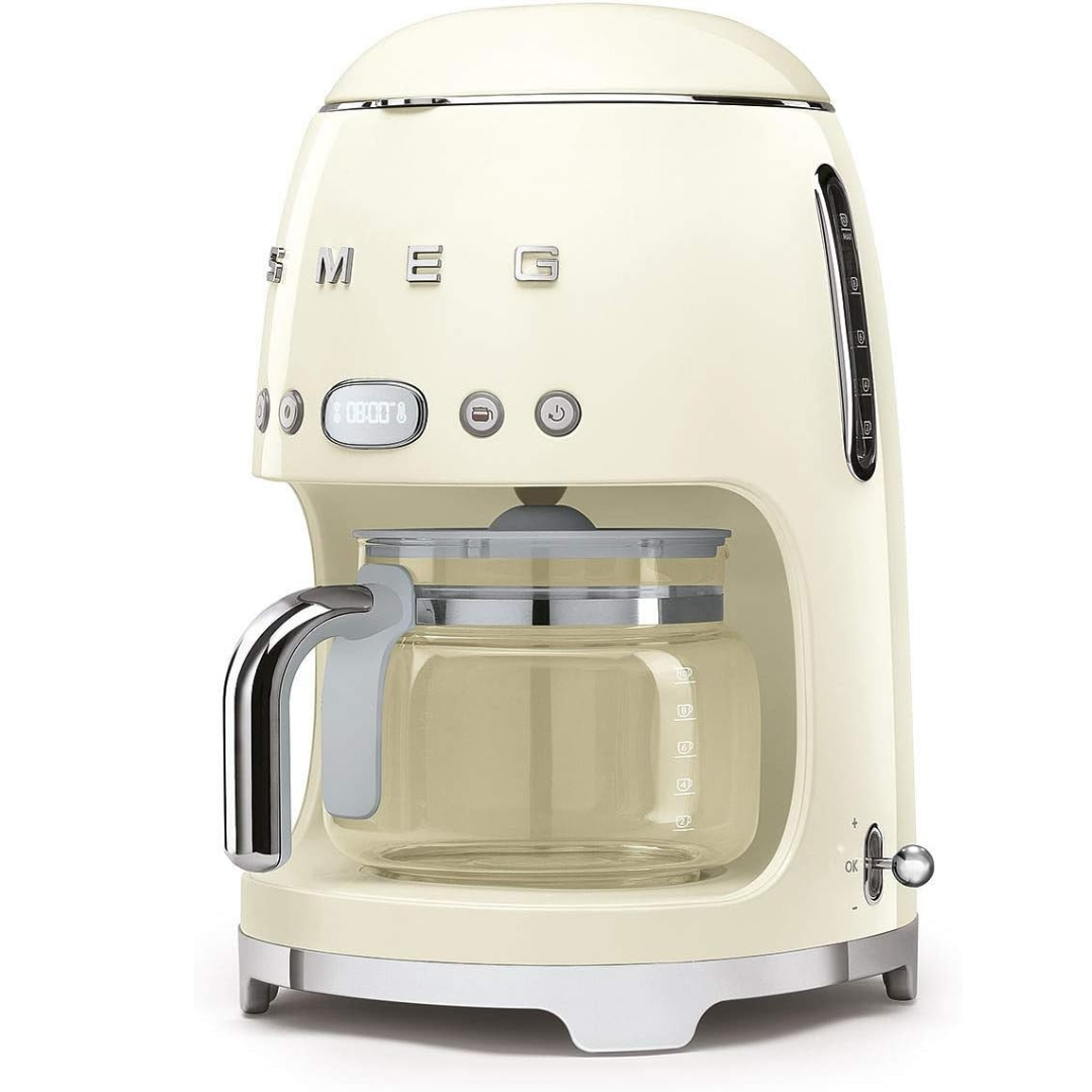 Smeg Coffee Machine Wake up to the enticing aroma of a barista-style coffee and get your mornings started the right way with the drip coffee machine from Smeg. The 1.4 litre water tank provides up to 10 cups of delicious coffee on a single use and the handy 40 minute keep warm function will let you enjoy your drinks throughout the morning. Each function of the coffee machine is easily navigated with the user friendly control panel, while the LED display provides clear visibility of the settings and clock. This machine gives you complete control, featuring an aroma intensity button, so you can make a richly-flavoured coffee at the touch of a button. The auto start mode provides more freedom to your coffee making, as you can programme the machine to commence at a given time. An anti-drip system helps avoid spillages, while the anti-slip feet provide added stability on your kitchen counter top. Features: 10 cup capacity coffee maker 40-minute keep warm function Reusable coffee filter with handle Glass carafe with handle and lid 1.4 Litre water tank Aroma intensity selector button Programmable auto-start mode Deliciously Aromatic Coffee This machine gives you the coffee shop experience in the comfort of your home. The aroma intensity selector offers two options light or intense so you can create a richly-flavoured coffee to cater to your taste buds. It also features a 1.4 litre capacity, enough to make up to 10 cups on a single use. Programmed and Ready You can programme the coffee machine to start at a given time to suit you, so you can enjoy a nice caffeine boost and begin your day in the best way. The user friendly control panel and LED display provide clear visibility of the current settings and clock function. Designed for Convenience Designed to ensure safe operation, this coffee machine includes an anti-drip system that helps avoid spillages, while the anti-slip feet provide added stability on your kitchen counter top Technical Details Brand Smeg Model Number DCF02CRUK Color cream Product Dimensions 10.08 x 9.65 x 14.21 cm; 3.4 kg Capacity 1.4 Liters Power / Wattage 1050 watts Voltage 220 Material Combination Auto Shutoff Yes Special Features Jug Item Weight 3.4 Kilograms