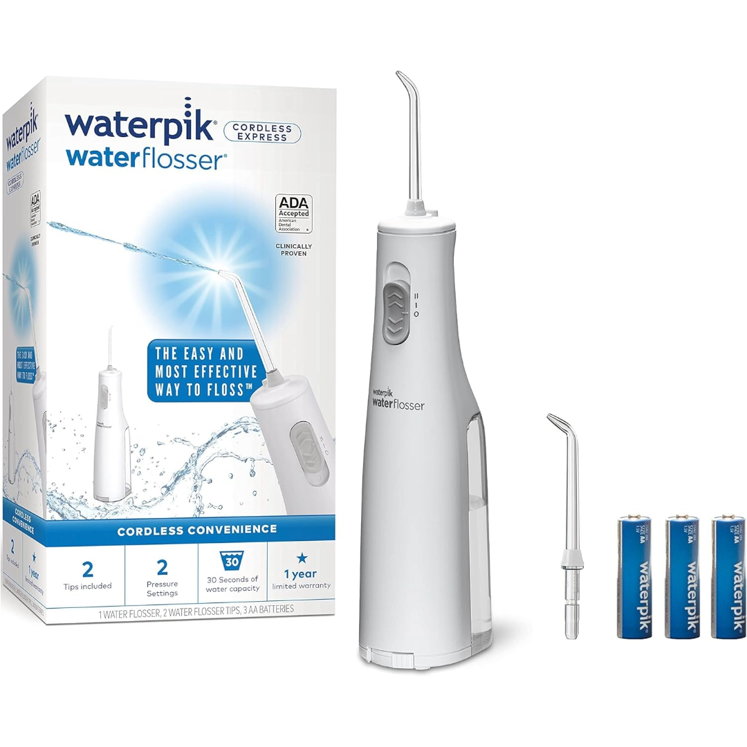 Battery operated and waterproof, the Waterpik Cordless Express water flosser is perfect for smaller bathrooms and travel, or when you want the convenience of water flossing in the shower. It combines water pressure with pulsating action for an exceptional cleaning, removing harmful bacteria and debris that traditional brushing and flossing can t reach. This lightweight, portable water flosser comes with 2 classic handheld flossing tips, a water on/off slider switch with 2 pressure settings, 3 replaceable AA batteries, and an easy-to-fill, removable 5-ounce water reservoir with up to 30 seconds of flossing time. The Waterpik Cordless Express water flosser removes up to 99.9% of plaque bacteria that causes gingivitis, cavities, and bad breath from treated areas and is clinically proven up to 2X as effective as string floss for removing bacterial plaque and improving gum health. Waterpik is the #1 water flosser brand recommended by dental professionals, and the Waterpik Cordless Express water flosser is accepted by the American Dental Association (ADA) for safety and effectiveness. Backed by a 1-year manufacturer s limited warranty, see product manual for details. Safety Information CAUTION: Use only recommended 3 AA batteries. Replace batteries every 1-2 months for optimal performance. While waterproof shower use, do not submerge the device completely in water. Keep away from children. Do use if you have open oral wounds or severe periodontal disease. Consult your dentist before had dental surgery last 2 months. Stop experience discomfort bleeding. Directions 1. Fill the reservoir with warm water. 2. Place tip in your mouth. 3. Select desired pressure setting. 4. Turn on device and start flossing. 5. Rinse mouth after use. 6. Clean regularly. Cordless Convenience Great for Travel and Small Spaces With a battery operated, portable, and waterproof design, the Cordless Express Water Flosser by Waterpik is perfect for small spaces, travel, and use in the shower. It offers 2 pressure settings, a water on/off slider, 30 seconds of flossing time, and includes 3 AA batteries no charging required. With the versatile and compact Cordless Express, it s easy to water floss wherever life takes you. Why Choose Waterpik Creator of innovative oral health care products since 1962 Original inventor of the Waterpik Water Flosser Founded and based in Fort Collins, Colorado Waterpik Cordless Express Water Flosser, In the Box Cordless Express Water Flosser 2 Classic Jet Tips (JT-450E) for general use 3 AA batteries no charging or outlet required Brushing Alone is Not Enough Removes up to 99.9% of Plaque The Waterpik Water Flosser removes up to 99.9% of plaque from treated areas. The Waterpik Water Flosser is the first Water Flosser to earn the American Dental Association (ADA) Seal of Acceptance. Essential for Good Oral Health Just brushing leaves plaque and food debris behind, which can lead to gum disease, tooth decay, and bad breath. The Waterpik Water Flosser cleans deep between teeth and below the gumline where brushing and traditional flossing can t reach. One Minute a Day All it takes is one minute per day to enjoy brighter teeth and improved gum health. Because it removes plaque and debris, the Water Flosser also helps freshen breath, leaving your mouth feeling incredibly fresh and clean. Water Control on Handle Easily stop and start water flow with the convenient on/off switch. Technical Details Manufacturer Waterpik Item model number WF-02 Product Dimensions 9.14 x 6.35 x 29.85 cm; 331.12 g ASIN B07DQSC9B5